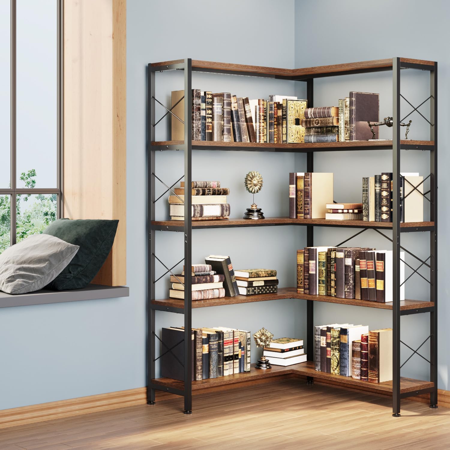5-Shelf Corner Bookshelf, Vintage Industrial L-Shaped Bookshelf Etagere Bookcase, Large Book Shelf with Metal Frame Open Storage Corner Cabinet (Retro Brown-5 Shelf)