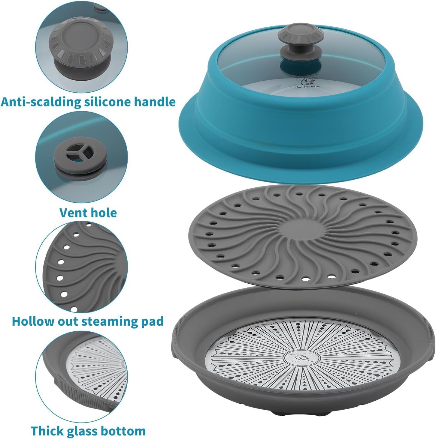 - 【Food Grade Material】: Food safe durable tempered glass and silicon, BPA and chemical free, High-temperature resistant glass, Foldable silicon microwave cover, Includes plate cover and tray to protect your microwave from splashes and spots. The tray has two handles to prevent burns and allow you to quickly remove heated food.