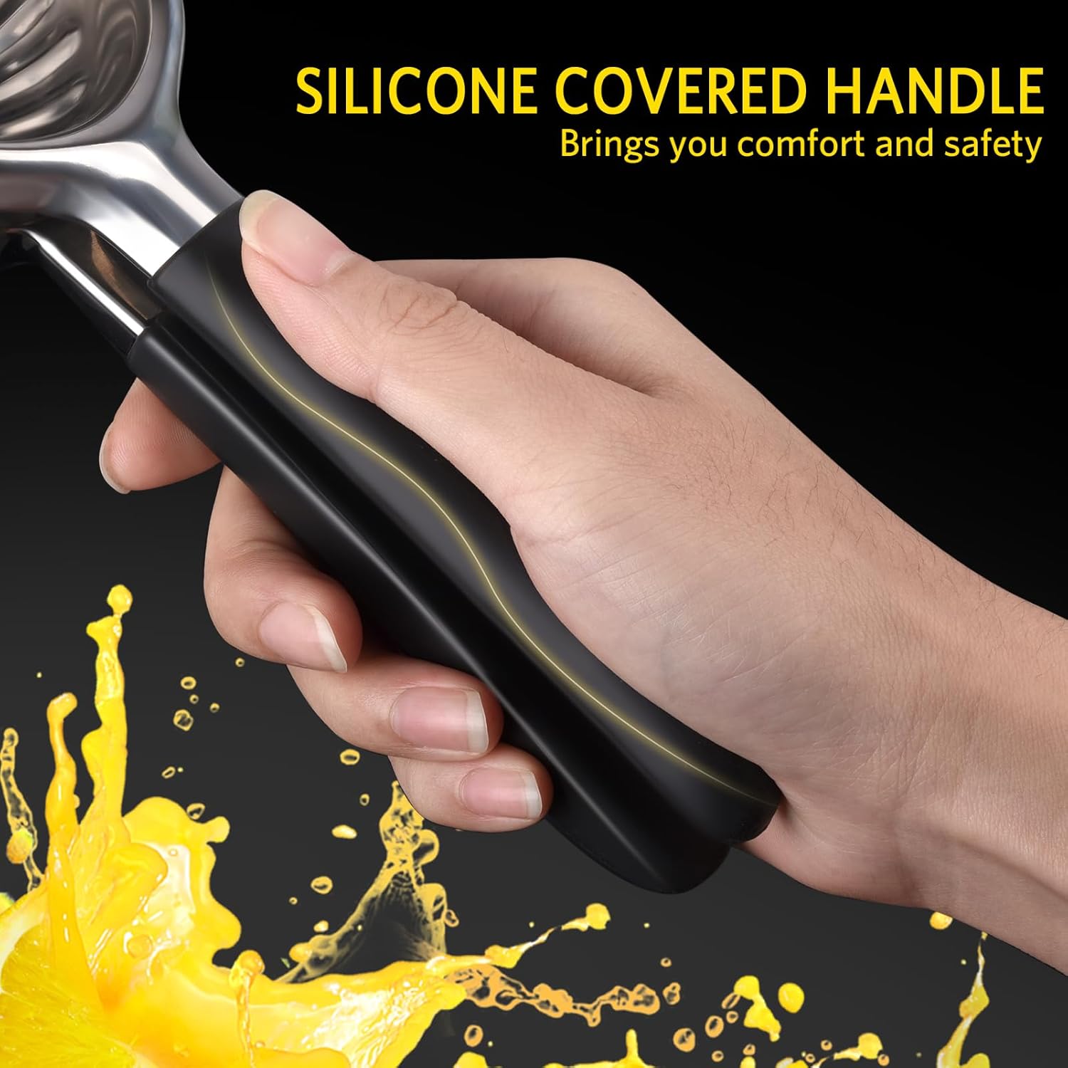 - Ergonomic Handle: The extended handle is made of comfortable, thick, and soft and high-quality silicone, making juicing effortless while avoiding hand pain. The presence of the silicone handle also avoids the handle from being wet and slippery caused by juice spills