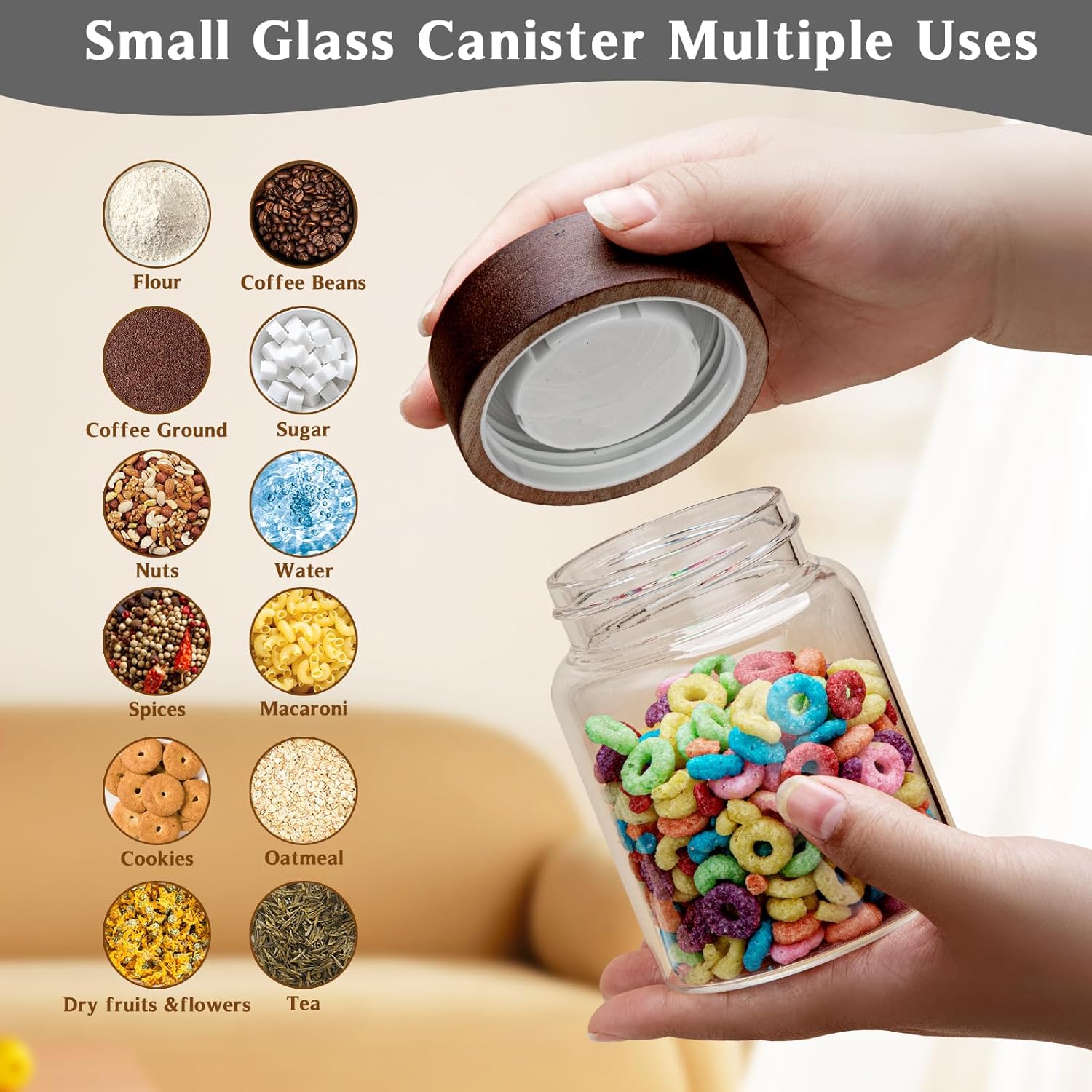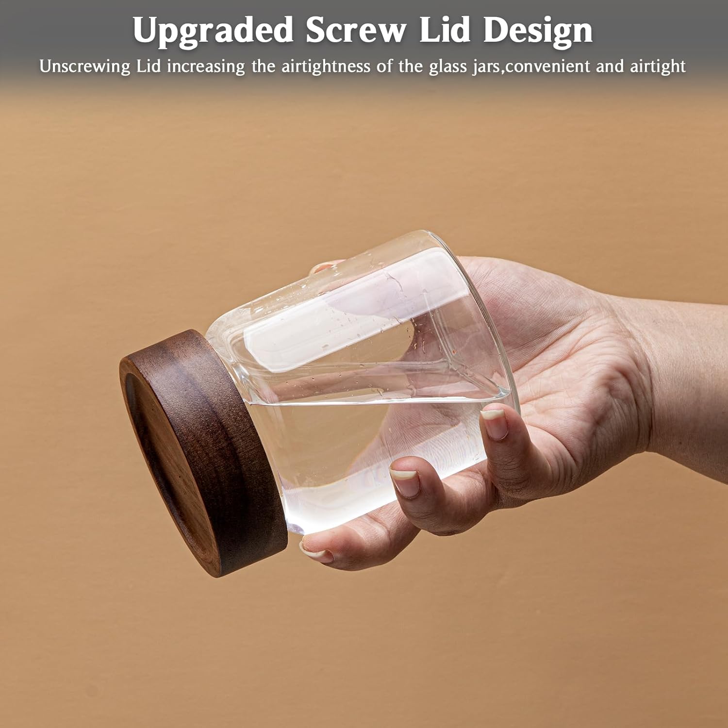 - 【WIDE APPLICATIONS】Glass canning jars storage are suitable for storing various dried ingredients to retain their freshness.Glass jars with wood lids perfect for storing dry food , such as,cookies,dried beans,liquid,pepper,oatmeal,jams,chutneys, rice, flour, tea, coffee, biscuits, candy,cheese,flour, sugar, seeds,etc. Keep your kitchen tidy and safe,saving space and convenient .