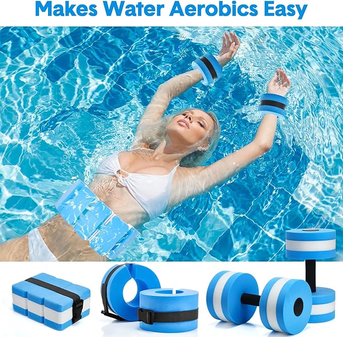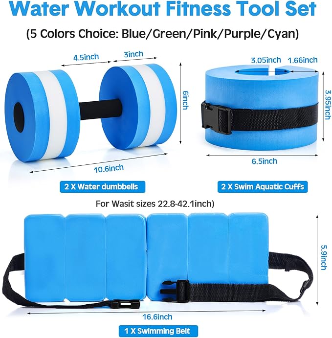 - Complete Package for Water Fitness: this water dumbbell set is a comprehensive package for your water workout regime, including 2 foam swim aquatic cuffs, 2 lightweight aquatic exercise dumbbells, and 1 swim belt, which ensures a full body workout, improving your overall fitness
