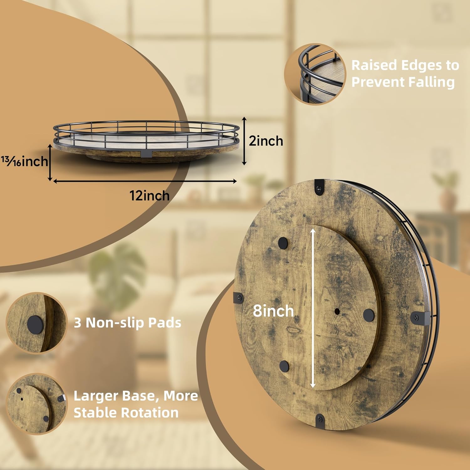Lazy Susan Turntable Organizer for Table Top, 12’’ Round Wooden Lazy Susan for Cabinet Kitchen Countertop Pantry Dining Coffee Table for Condiments Spices, Rustic Bathroom Vanity Tray for Soap Candle