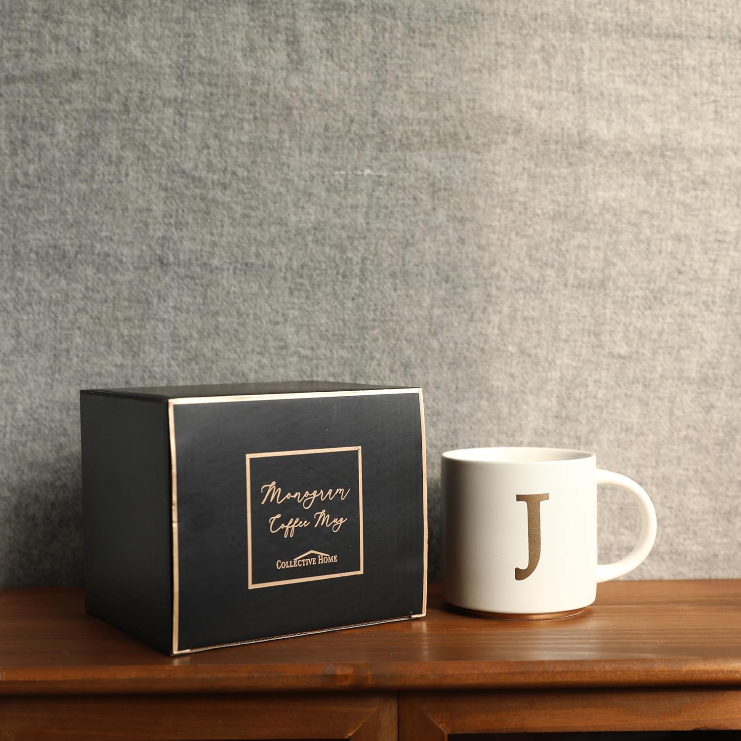 COLLECTIVE HOME - Monogram Ceramic Mugs, 15 oz Golden Initial Coffee Cups, Elegant Alphabet Tea Mugs, Elegant Personalized Mug with Gift Box, Unique Mug with Double Side Capital Letter (J)