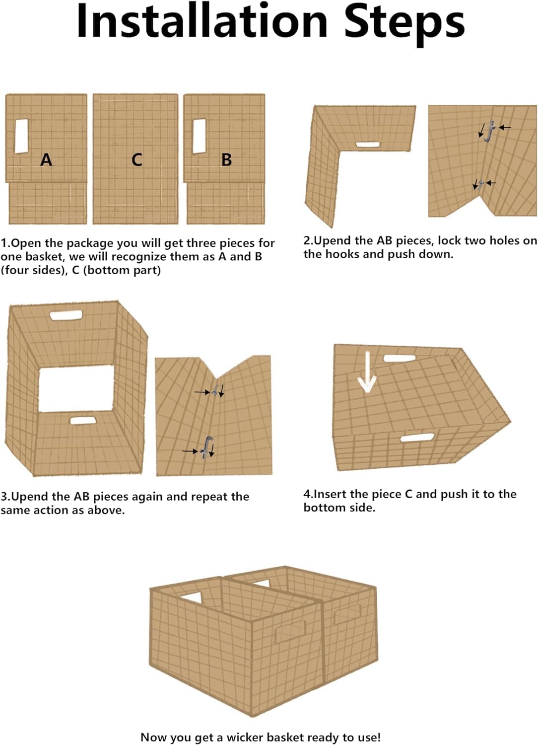 - Easy to assemble:When you receive the package, the wicker storage basket is folded, you should install it according to instructions, you will get a perfect wicker basket. You can fold them completely flat and stack them up against each other to save space when not in use.