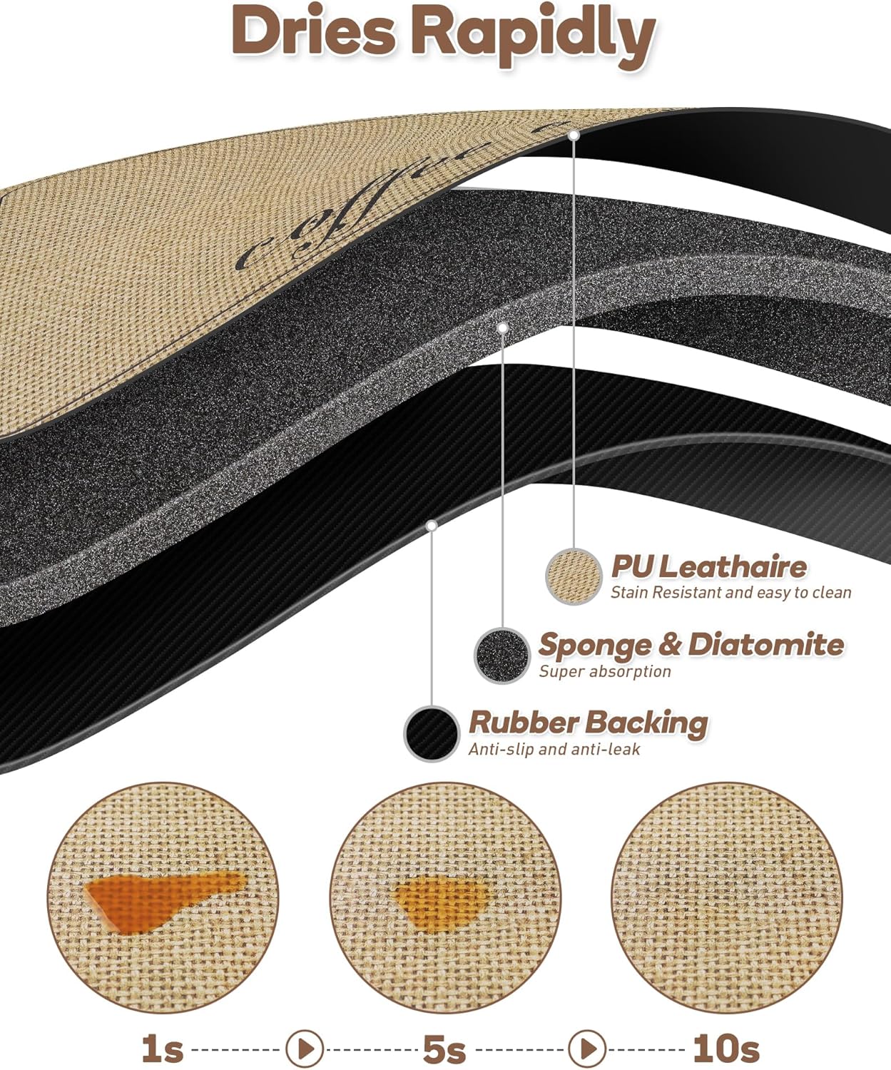 - Easy To Clean - Featuring a PU leathaire surface, this coffee mat is both stain-resistant and easy to maintain. You can simlpy wipe up the spills and grounds, or give it a quick rinse, and the mat will look as good as new. It provides excellent protection for your countertop against splashes and drips, effectively keeping it free from coffee stains.