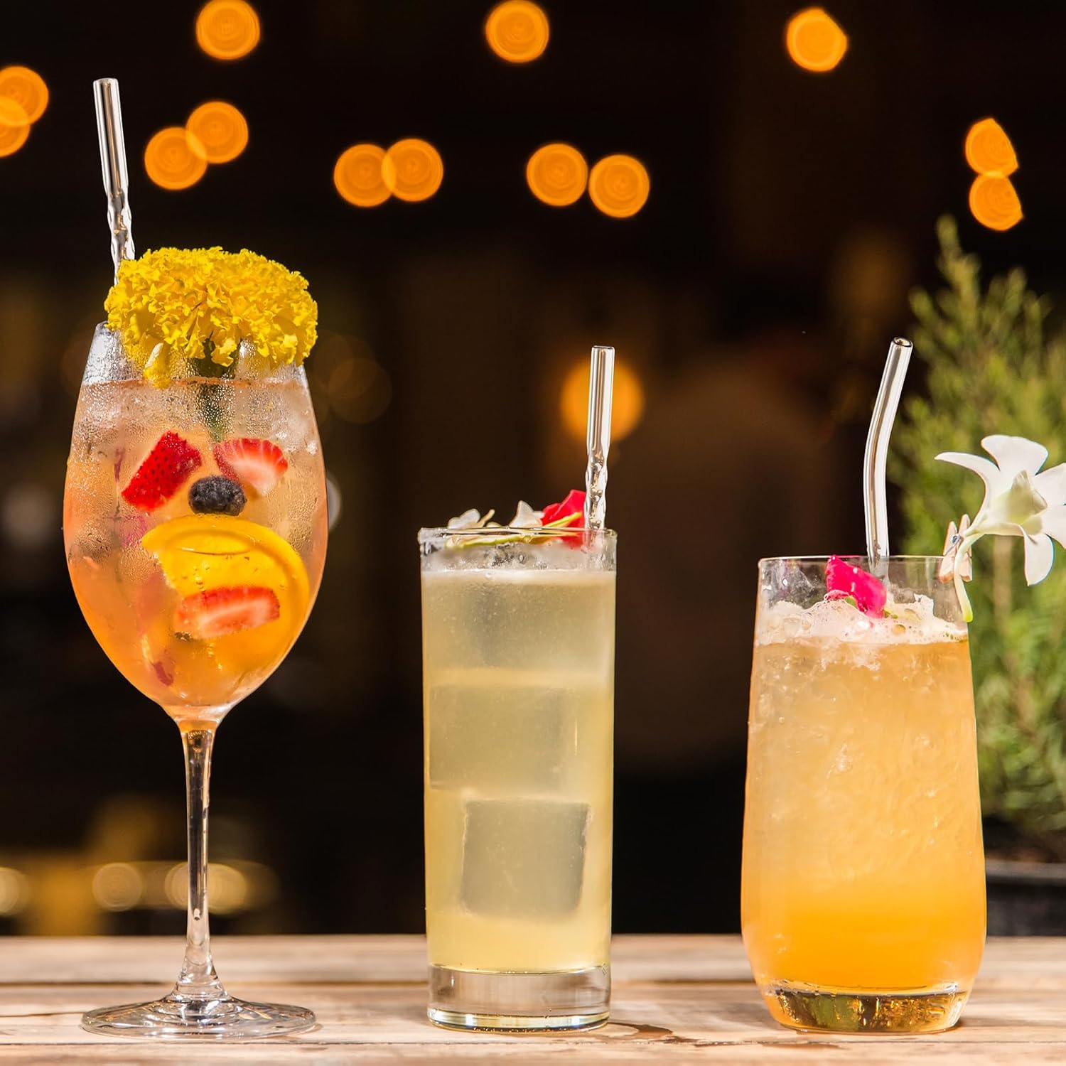 - Our 8 colorful twist glass straws allowing for creative and colorful coordination with your favorite drinks and cups. These aesthetic glass straws work great with all sorts of drinks – sodas, iced beverages, milkshakes, smoothies, water, coffee, hot or ice tea, milk and cocktails, you name it. Our glass straw is perfect for parties to get-togethers or special events, bringing a laid-back and fun vibe to the scene.