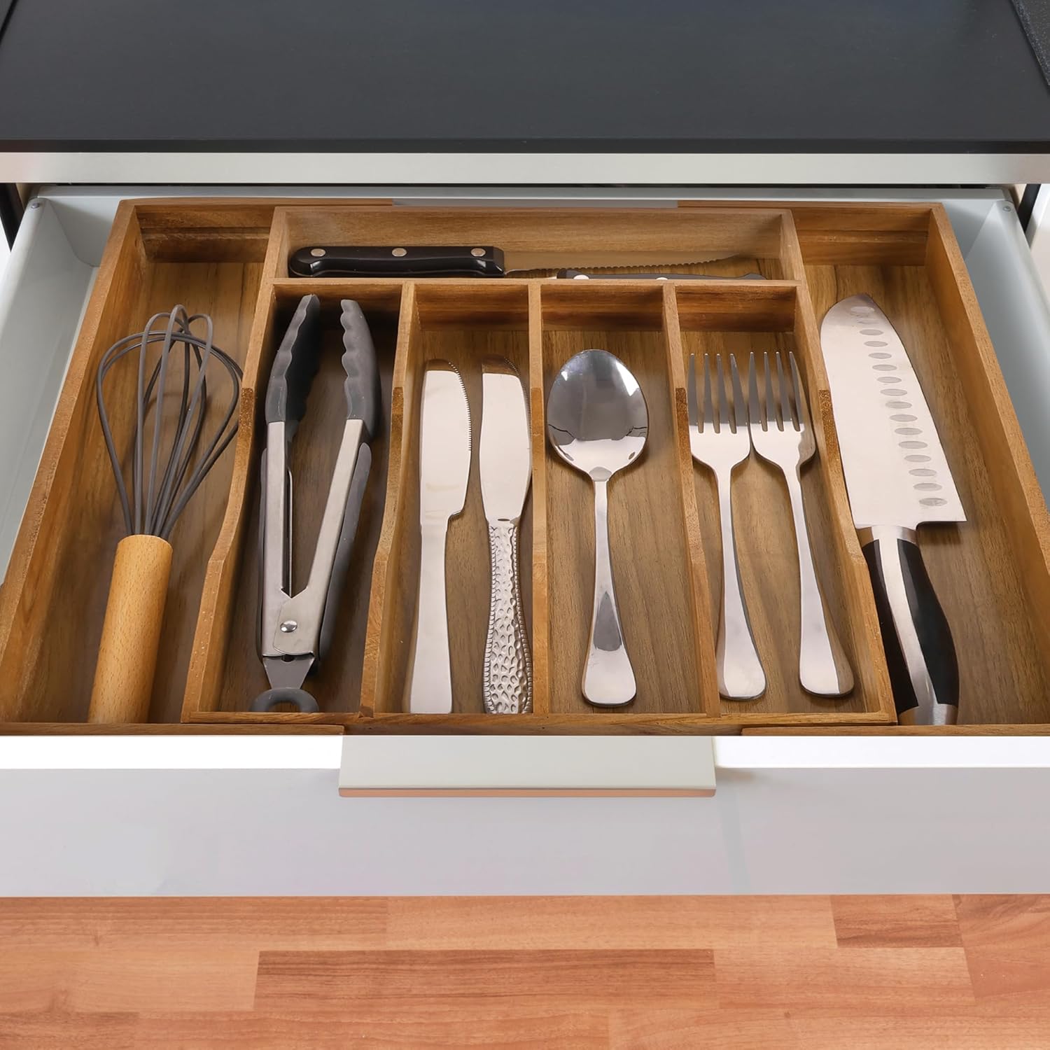 - [RELIABLE DURABILITY]: Your natural and earth-friendly acacia cutlery tray is sturdy and durable - not easy to crack and warp - thanks to a series of dehydration, drying and other processes to eliminate the inner stress. Well polished surface and edges will not hurt your hands. The Traditional tight assembly structure adds extra durability. With the smooth sliding design, your adjustable cutlery and utensils organizer can fit over 95% standard sized drawers.