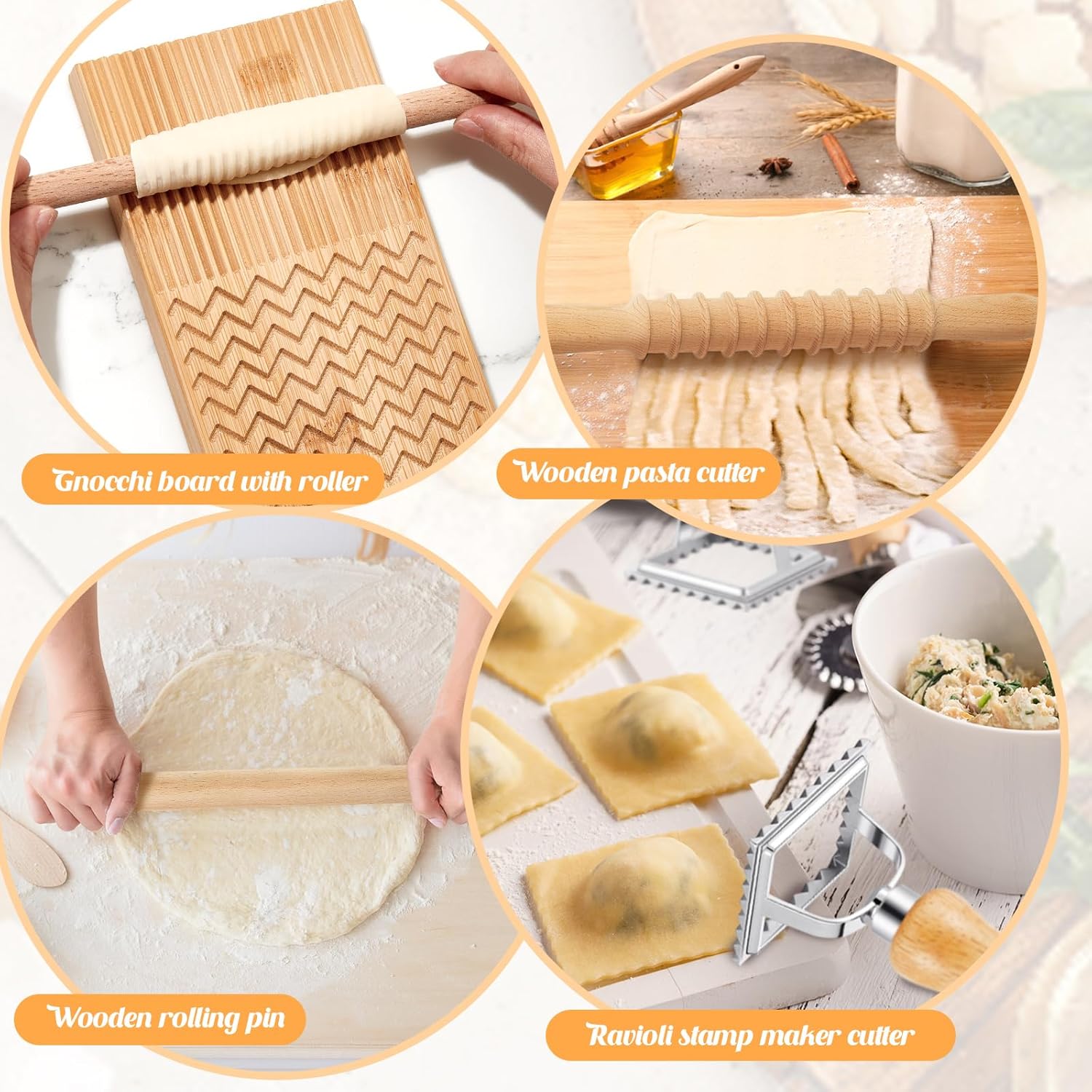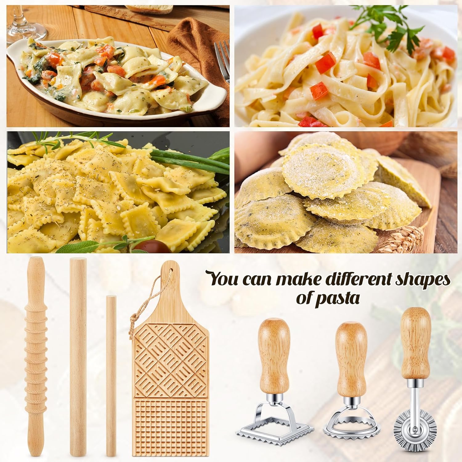 - Comprehensive Pasta Making Set: this package includes a wooden pasta cutter, a ravioli rolling pin, a gnocchi board, which has the different styles in front and back, a pasta roller, and 3 pieces of ravioli stamp maker cutter, each differently, including round, square, and rollers; These tools combine to create a set that meets your pasta making needs