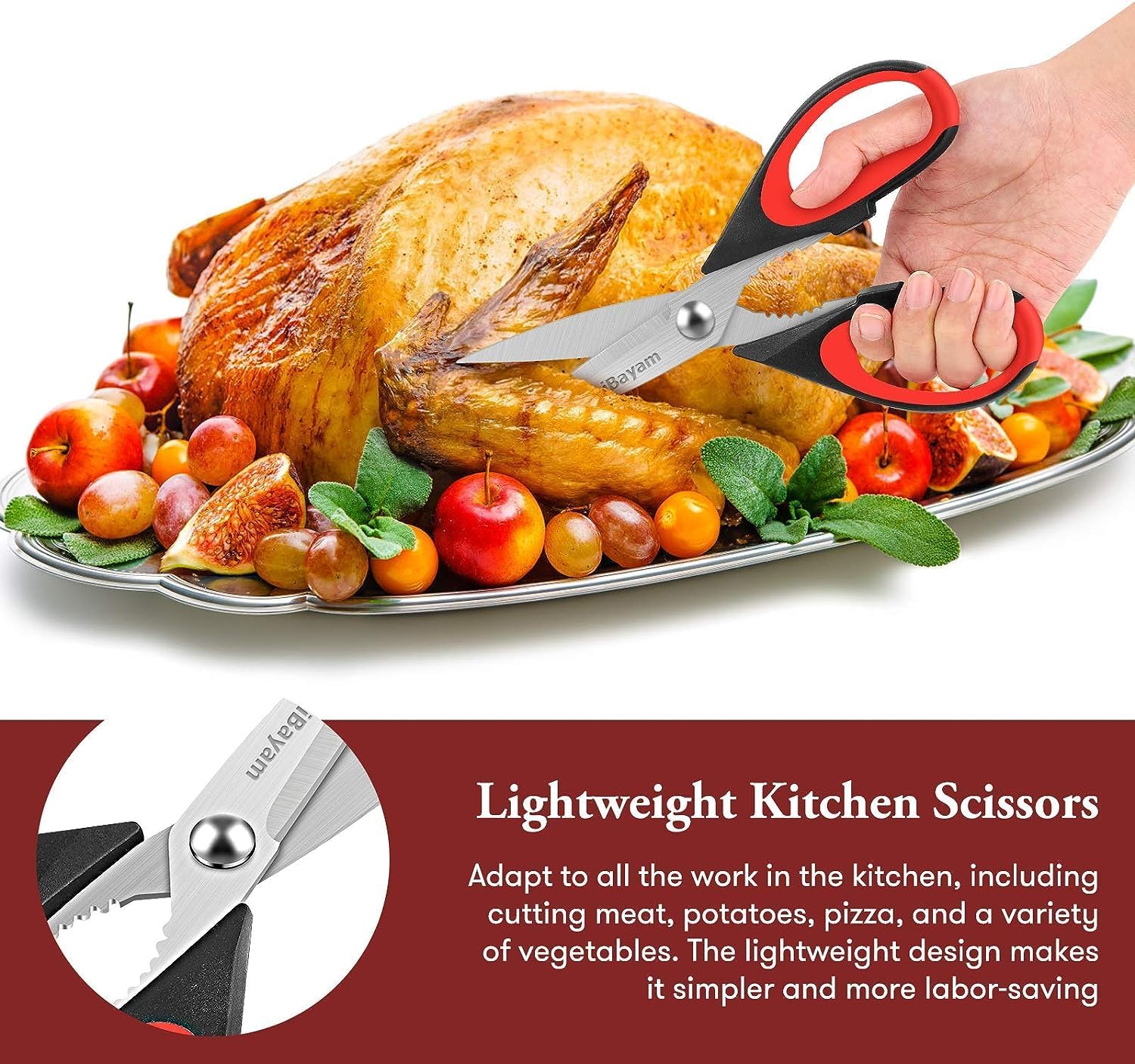 - 1. Versatile kitchen scissors: These all-purpose shears are perfect for food, meat, vegetables, chicken, poultry, fish, herbs, seafood, BBQ, and food packing bags – essential utility scissors for kitchen, home, apartment, and camper.【patented design】