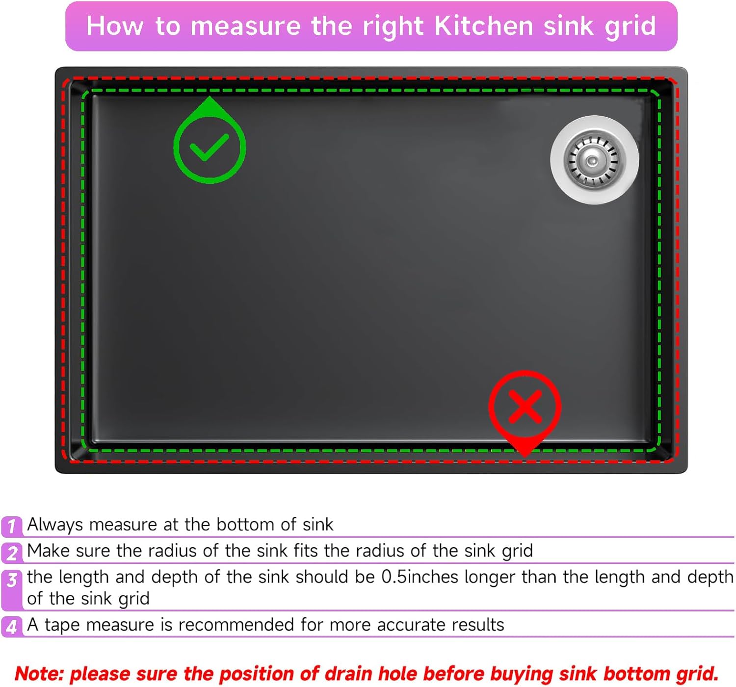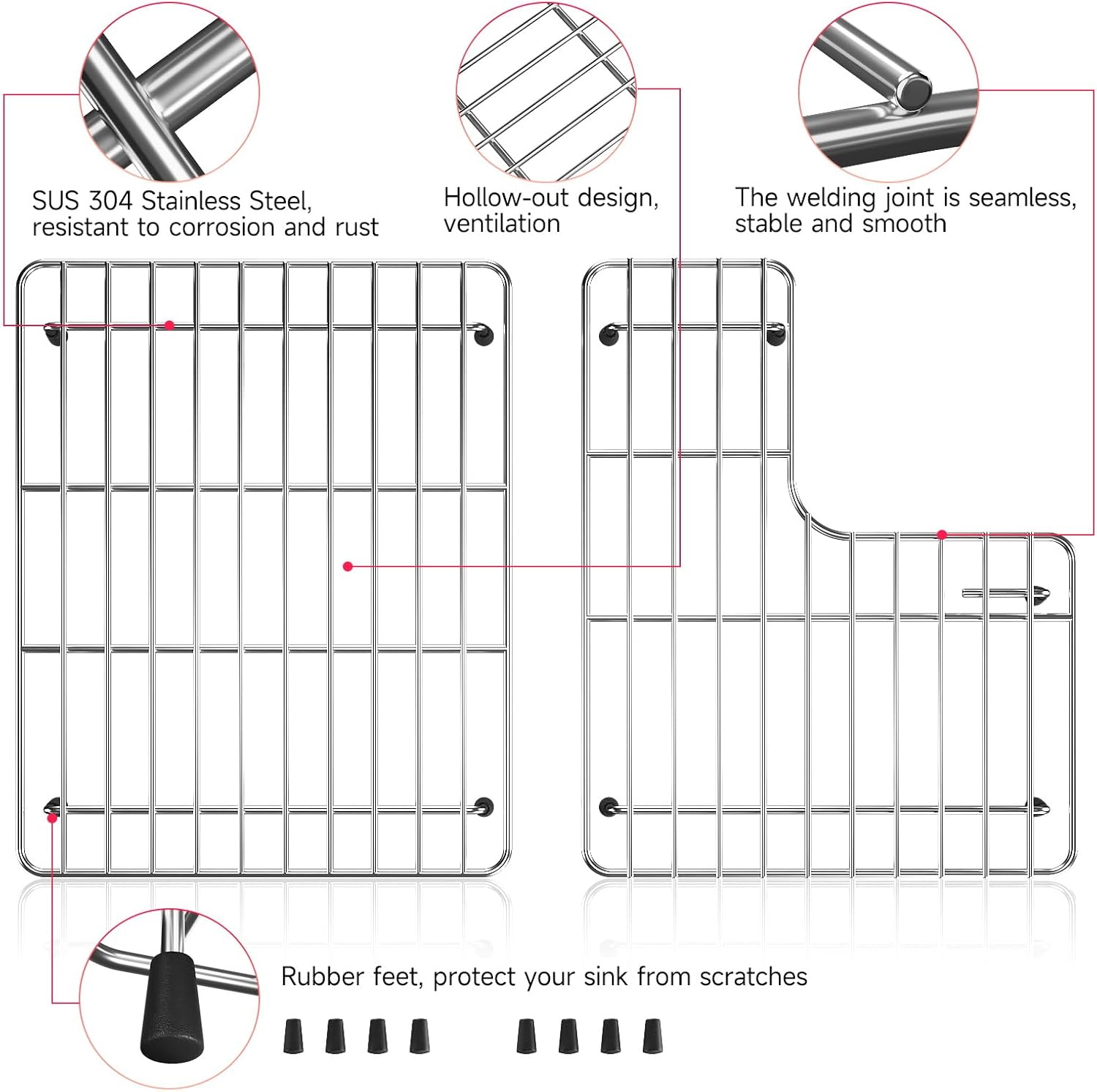 - Premium Material: We Strictly select materials, made of 304 stainless steel(not cheap 201) to ensure durability and no rust. The stainless steel surface is treated by electroplating process, and the solder joints are carefully polished by us to ensure that the detailed position is smooth and does not hurt your hands, so that you can use it easily. In addition, there are 9 rubber feet specially configured for this sink grid to effectively prevent scratching your sink