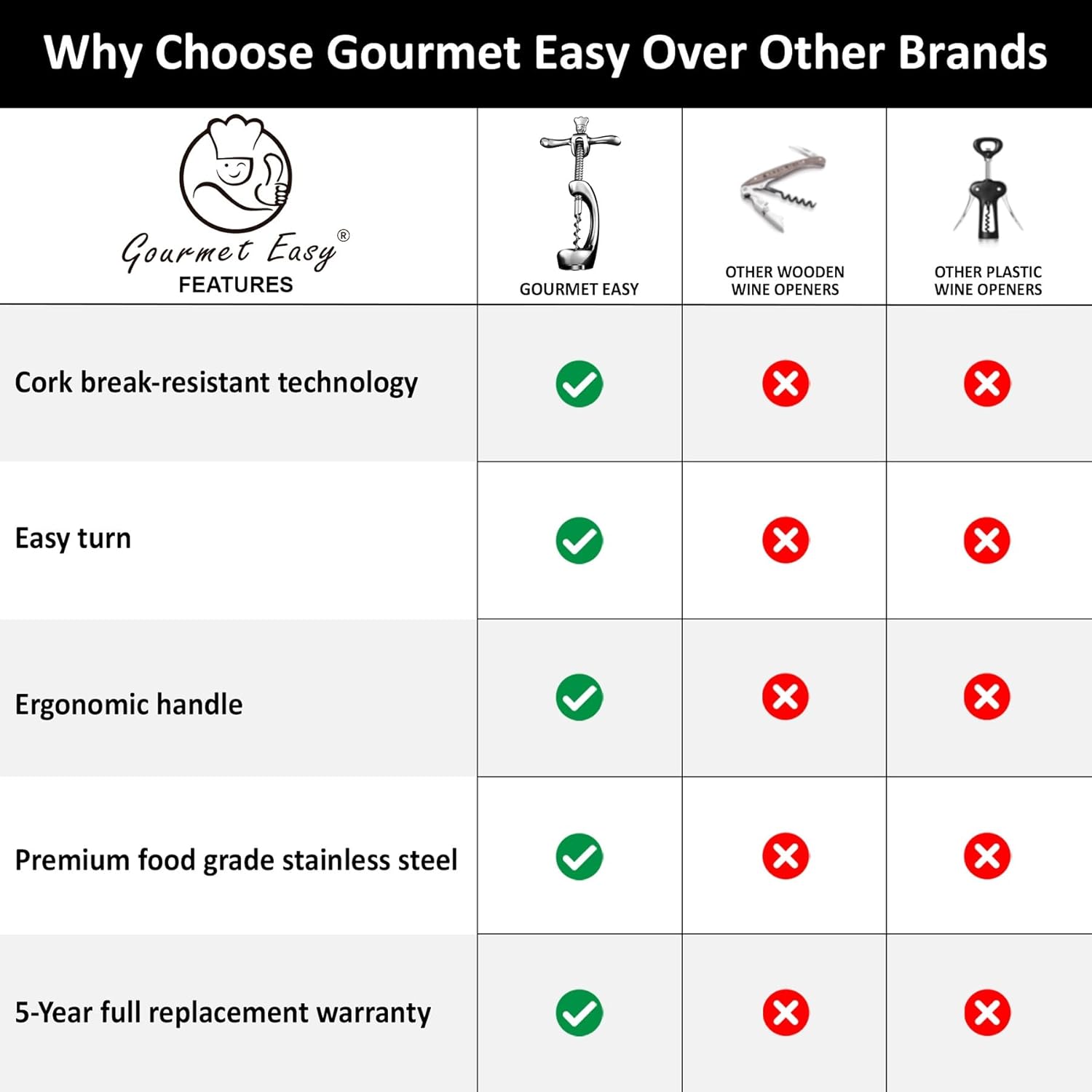 - UNCONDITIONAL 5-YEAR WARRANTY - Our handheld travel corkscrew comes with a 5-year warranty. Gourmet Easy uses the highest-grade materials to ensure your premium wine opener lasts a lifetime!