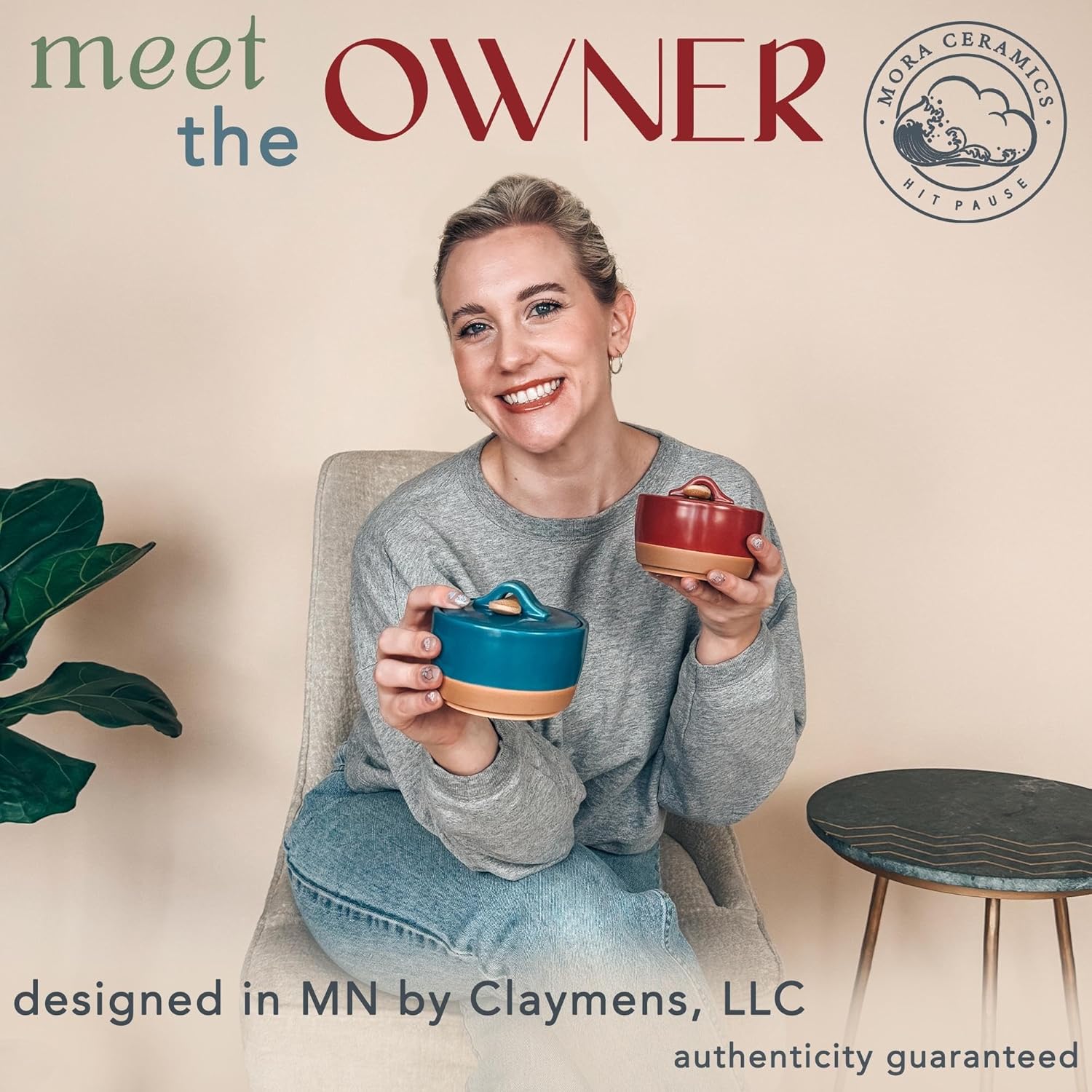 Mora Ceramic Salt and Pepper Cellar Set with Lid - 10 oz Modern Canister/Container/Bowl for Storage, Sea Salt, Spice, Sugar, Countertop - Small Dish/Jar with Wood Spoon, Azure Blue & Crimson Red Crock