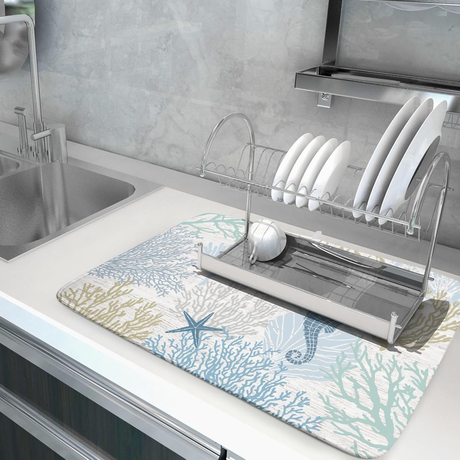 Blue Coral Dish Drying Mat Coastal Starfish Dishes Pad Hanging Drainer Mats Reversible Absorbent Kitchen Counter Protector 18x24 Inch