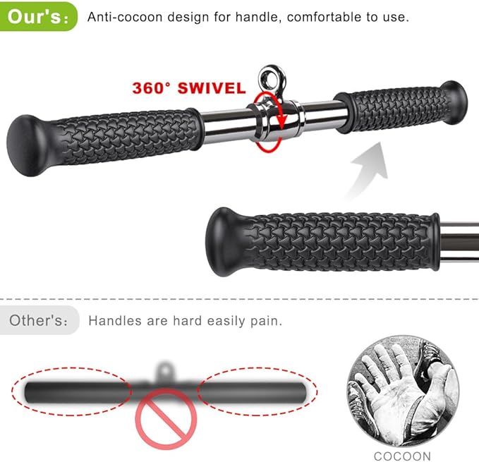 - 【Rotating Straight Bar】This 18-inch straight bar features a 360-degree swivel design that allows you to perform various exercises such as press downs, curls, rows, and more. The knurled handles provide a secure and comfortable grip while the chrome-plated steel construction ensures long-lasting performance.