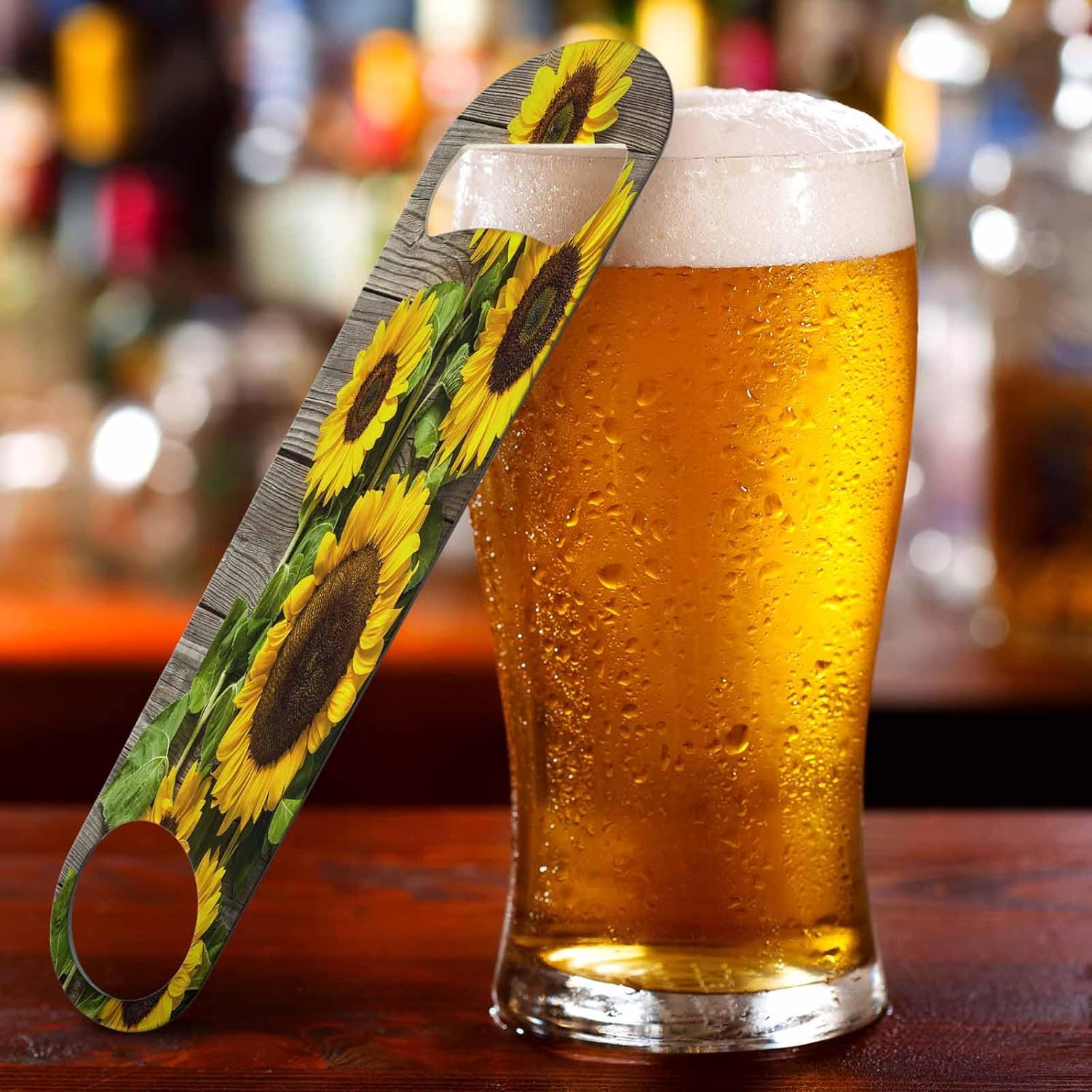 Sunflowers Stainless Steel Bottle Opener Wooden Board Yellow Flower Rustic Fence Natur Color Simple Flat Beer Bottle Opener Keychain for Home Kitchen Bar Restaurant Party Birthday Gift