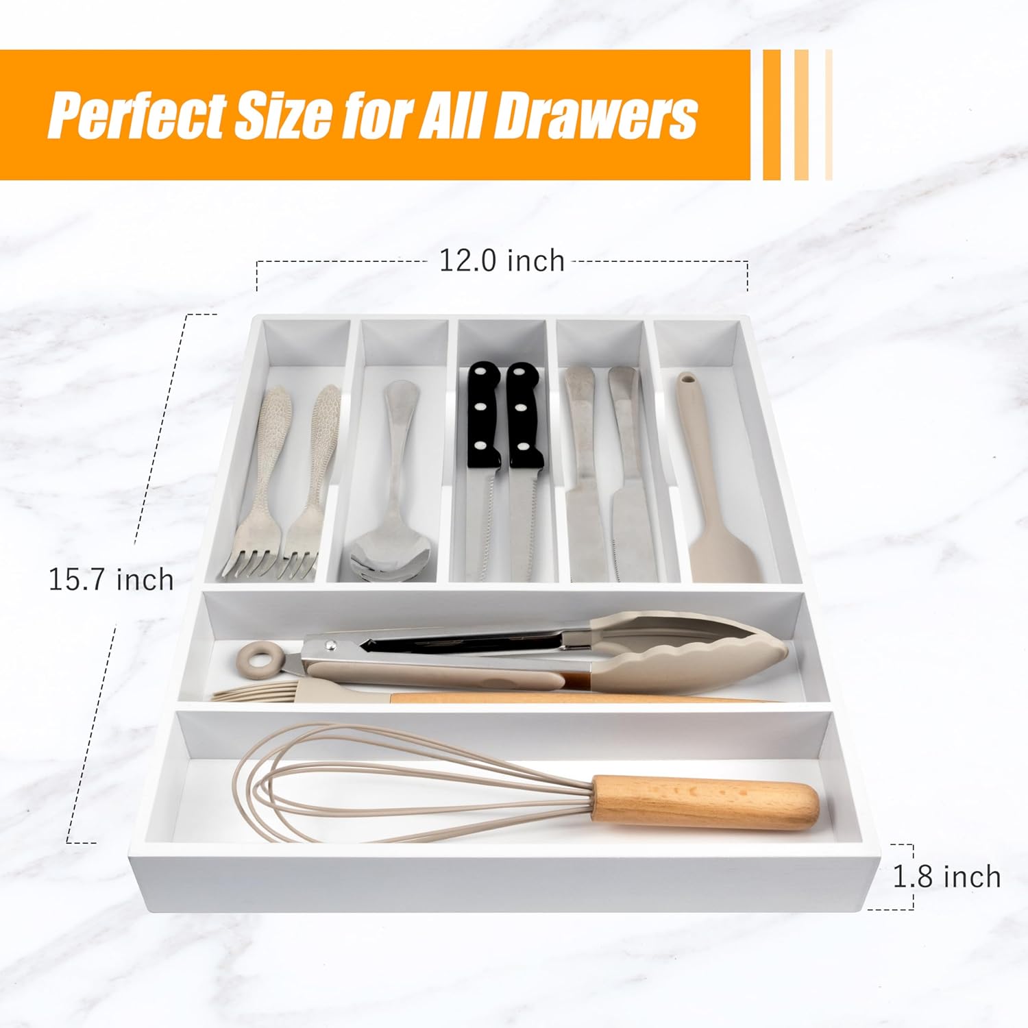 - ✅【Good Helper for Home Organization】Our utensil silverware drawer organizer flatware cutlery tray is designed to tackle the common issue of cluttered utensils and expanding junk drawers in the kitchen. Using our utensil silverware drawer organizer can help you keep your kitchen neatly organized. Measuring 15.7"x12.0", our utensil silverware drawer organizer features 7 spacious compartments, each with a 1.9" deep slot, making it convenient to organize and store kitchen utensils, rearrange them, and maintain an overall tidy and clean appearance.
