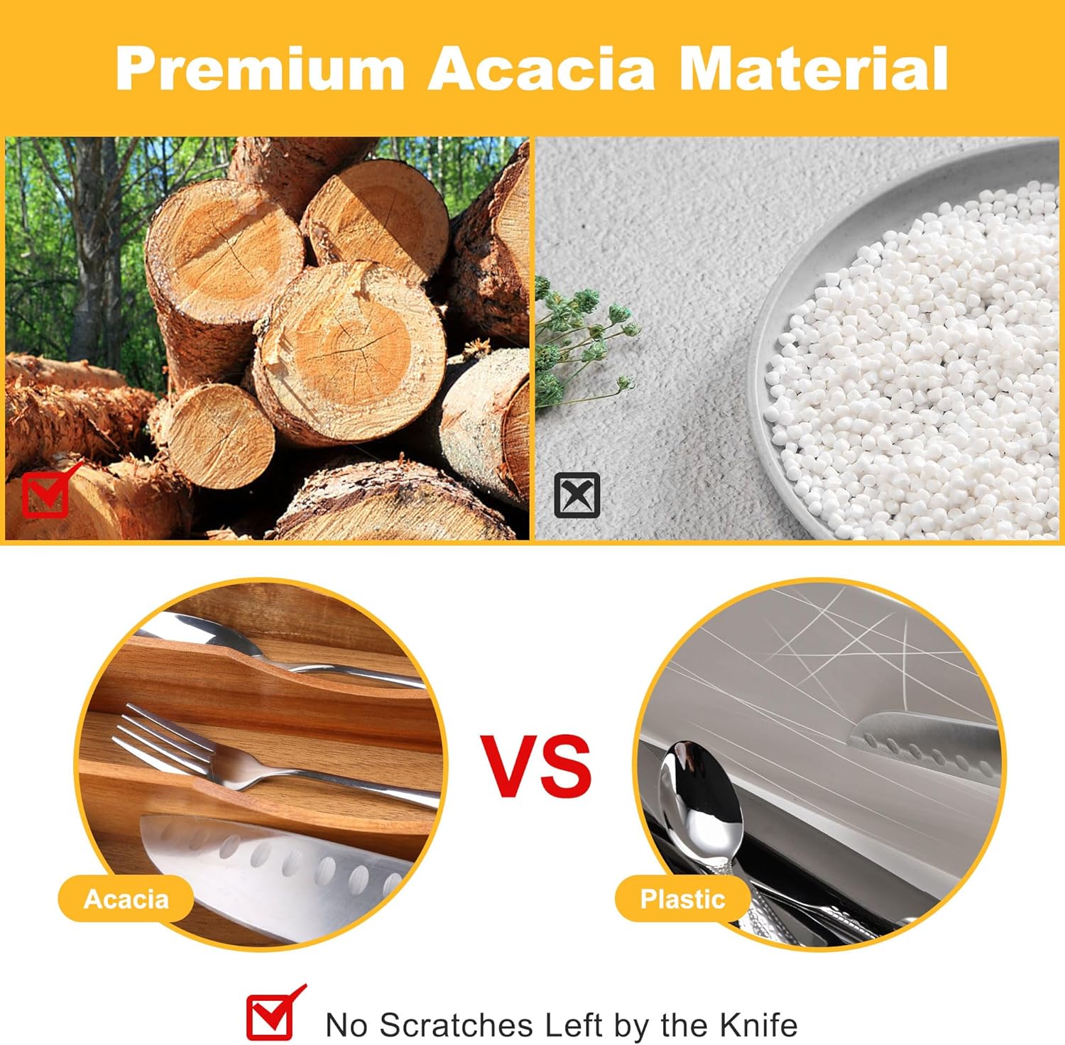 - ✅【Sturdy and Well-made】Our silverware tray for drawer is made of minimally refined natural acacia, a renewable, sustainable source, making them a green choice, with the age of over 4 years, which makes the silverware holder durable enough for long time use. Unlike the plastic and metal drawer organizer, our flatware & utensil is water & odor resistant, the silverware organizing tray is perfect for years of use, especially in kitchens where things can get messy quickly.