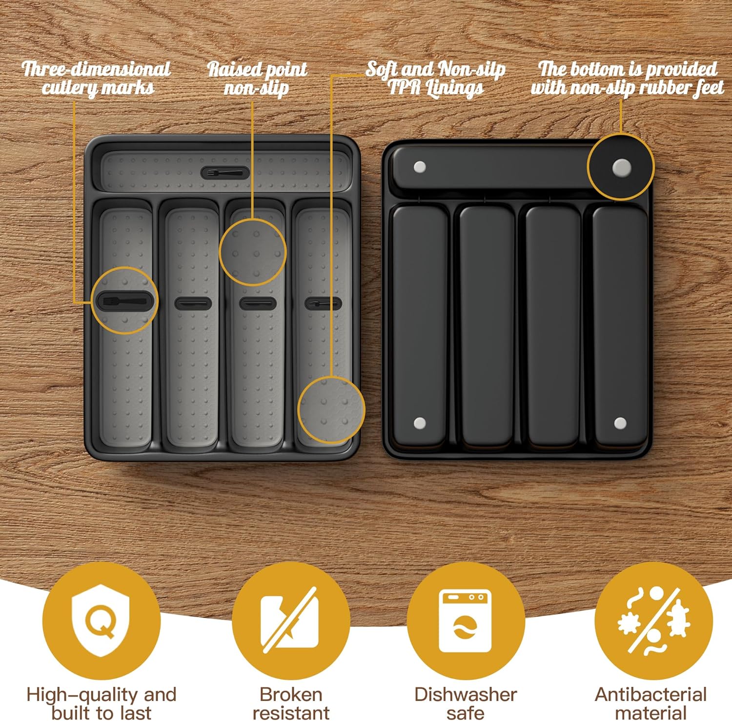 - Durable & Scratch-Proof Design for Everyday Safety Crafted from BPA-free plastic with soft TPU-lined slots, this cutlery tray protects your silverware and utensils from scratches. The non-slip rubber feet keep it firmly in place, even when drawers are opened quickly—no sliding or tipping. Safe for delicate items like jewelry or makeup brushes, it’s built to last through daily use in busy kitchens, damp bathrooms, or kids’ rooms.