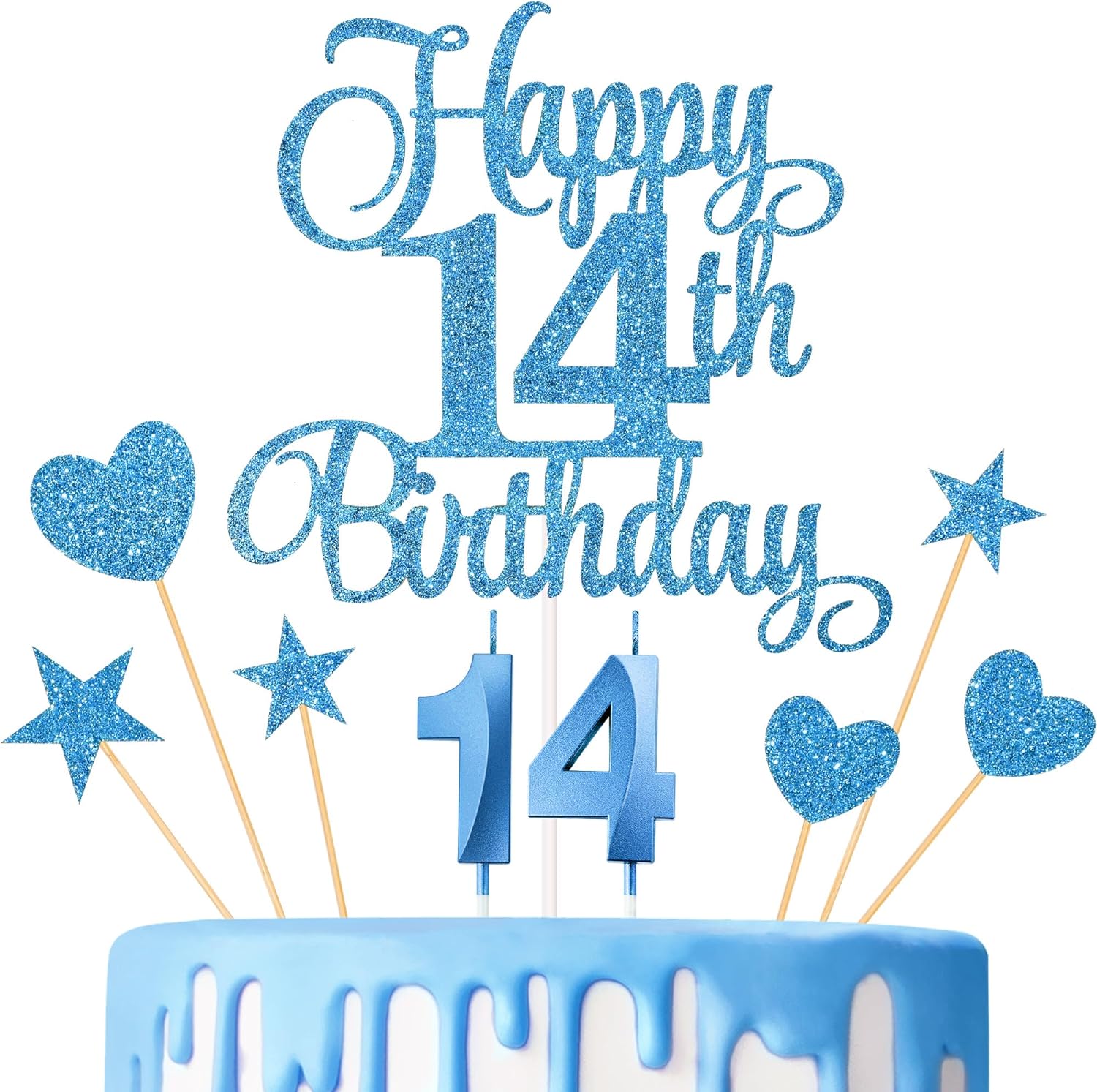 14th Birthday Cake Decorations, 14th Birthday Candles Cake Numeral Candles and Glitter Happy 14th Birthday Cake Toppers Set for Birthday Party Supplies (Blue)