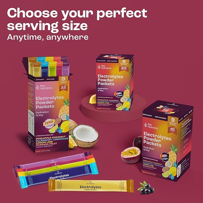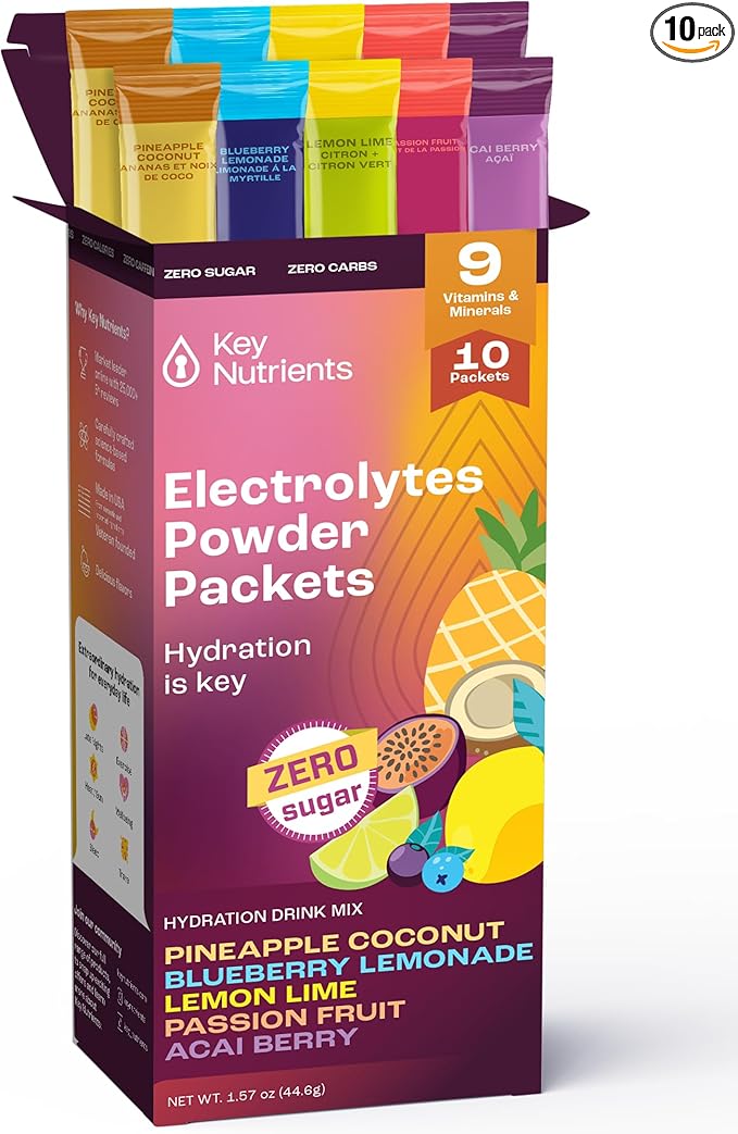 - Daily Hydration Electrolyte Powder Packets - Fatigued? Jet-lagged? Pulling an all-nighter? You need a balanced mix of electrolytes to keep your body energized and hydrated. Key Nutrients drink mix hydrates faster and better than water alone. Suitable for all diets and lifestyles, everyone can enjoy our on-the-go daily electrolyte hydration packets to power through whatever life throws.