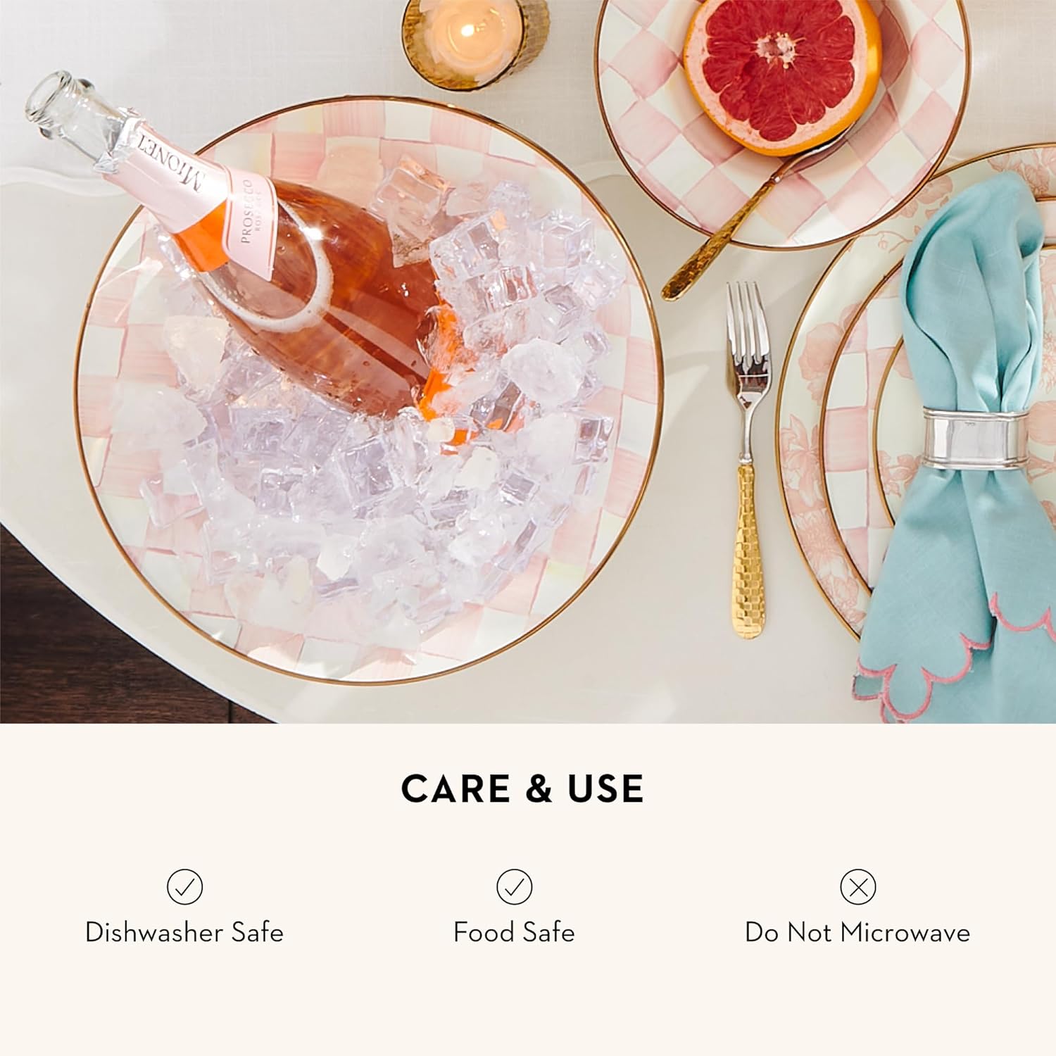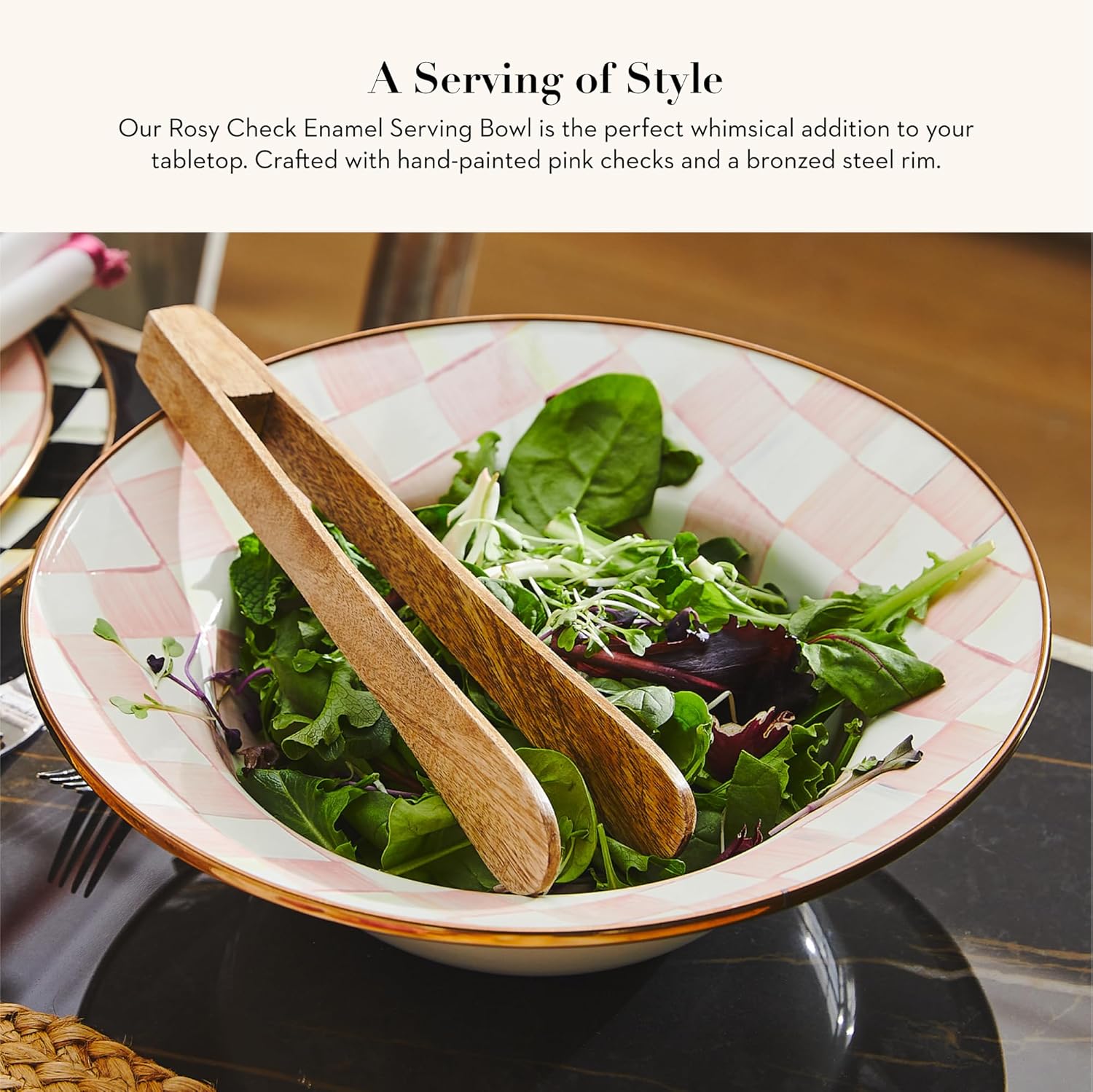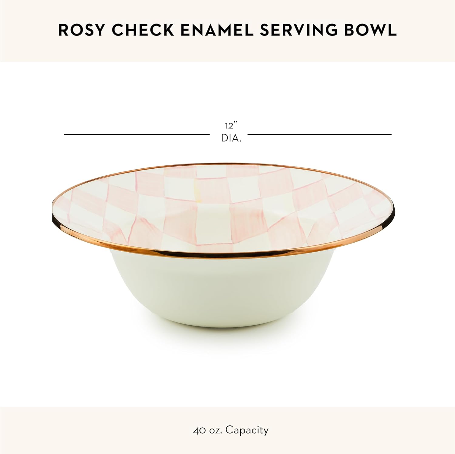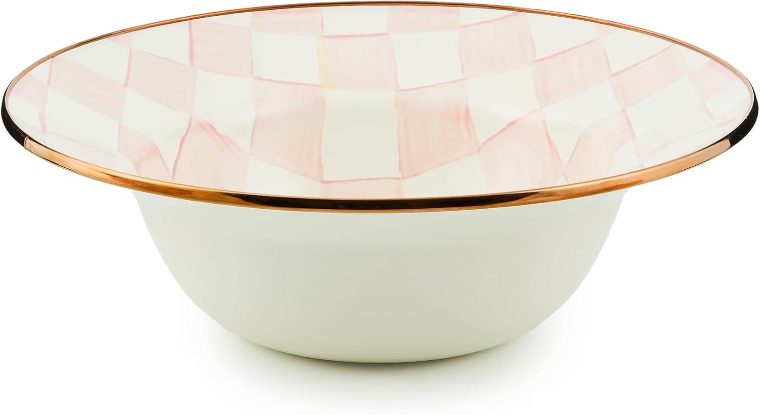 - ENTERTAINING & PARTY ESSENTIAL: The Rosy Check Enamel Serving Bowl features our pretty hand-painted pink-and-white checks over a hand-glazed steel underbody and has a bronzed stainless-steel rim.