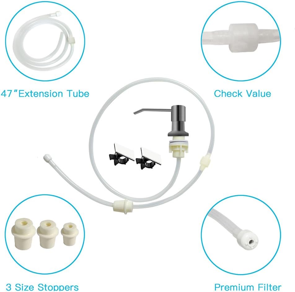- 【Multipurpose Use】: The extension tube kit made with food-grade silicone tube 47'' is soft and flexible, check valve make it easier to pump out the soap, keep soap primed at the top of the tube, and the three stoppers make it fit all kinds of containers or bottles. It also can be used as follow: hand soap, liquid dish soap, shampoo, shower gel, or even hand-lotion or moisturizer ideal for kitchen, hotel or commercial uses.