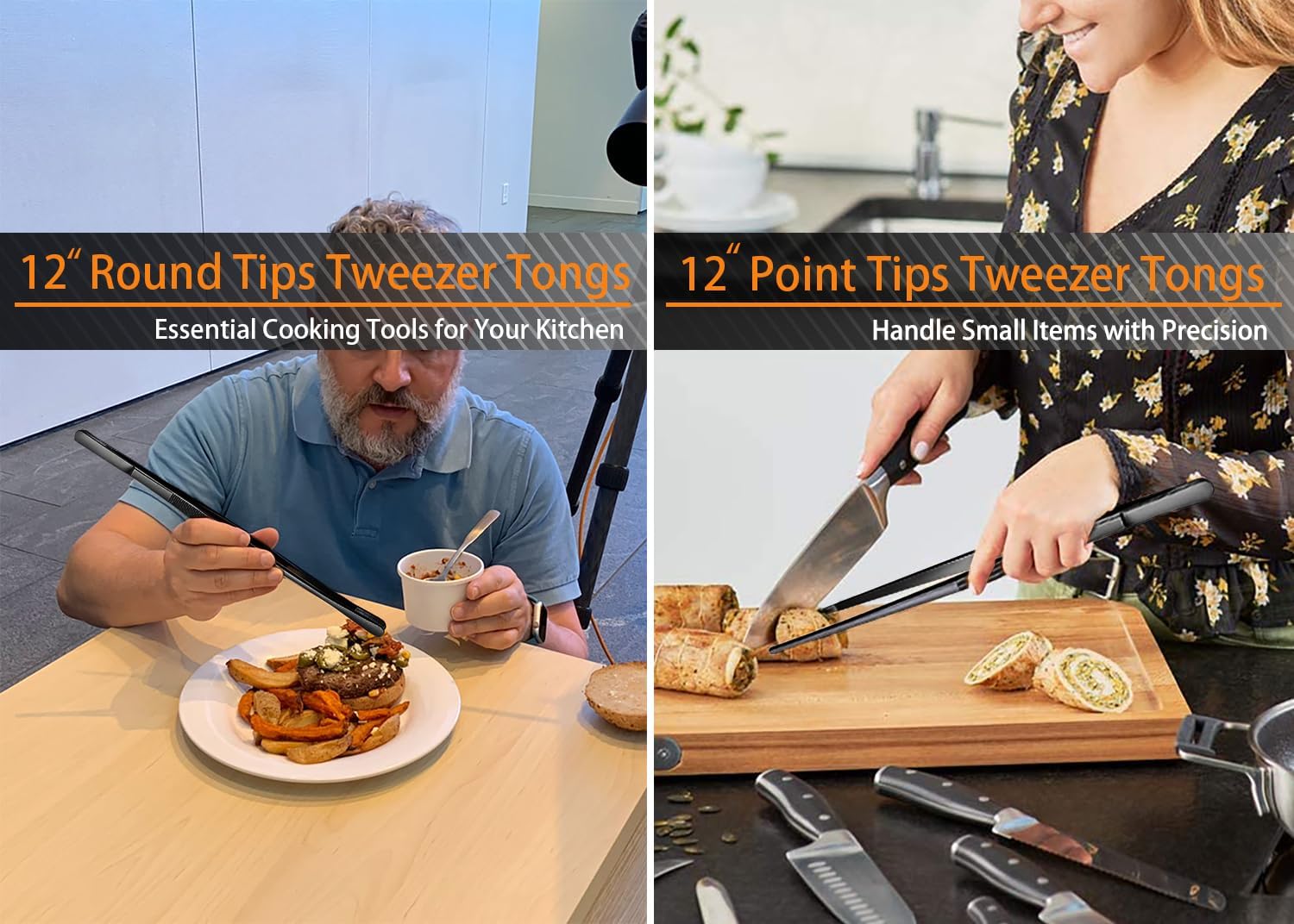 - PREMIUM STAINLESS STEEL - Tweezer tongs for cooking are made of high quality food grade stainless steel, rust -proof, anti-corrosive, sturdy and durability. Use the 12" long precision tweezers in the kitchen to extend your reach for cooking, roasting and plating. When exposed to heat, liquids, and awe inspiring environments, it will withstand the test of time.