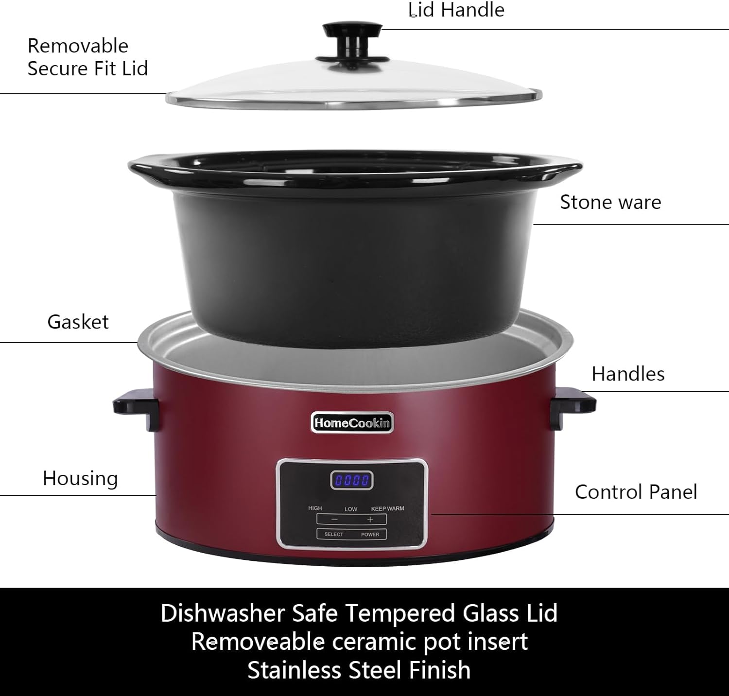 HOMECOOKIN 7 Quart Programmable Slow Cooker, Kitchen Appliances, Perfect Kitchen Small Appliance for Family Dinners, Red Stainless Steel