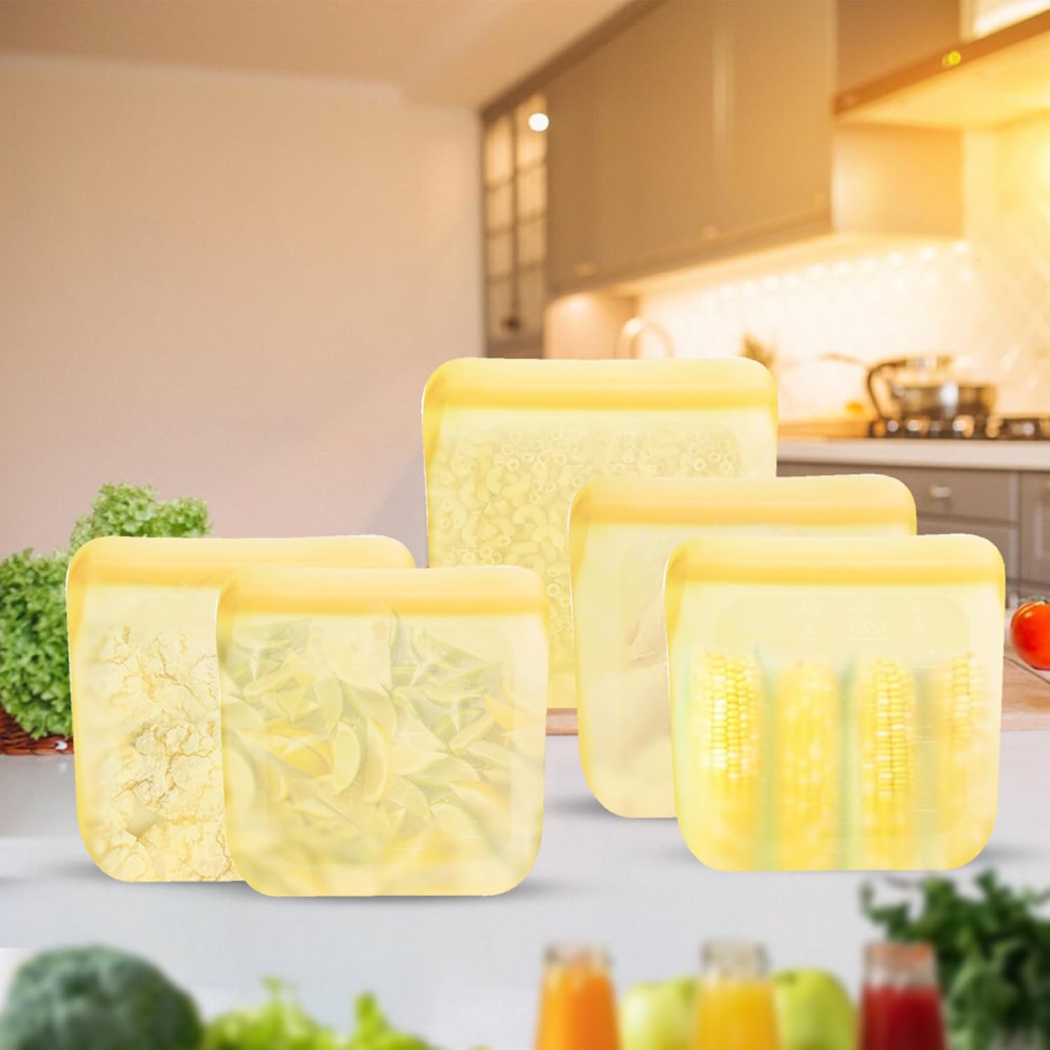 purifyou Set of 5 Reusable Silicone Storage Snack Bags 6oz / 16oz / 32oz / 64oz Self-Seal Food Storage Container for Fruits, Vegetables, Sandwiches, Dishwasher Safe & Leak-free (PastelYellow, 32oz)