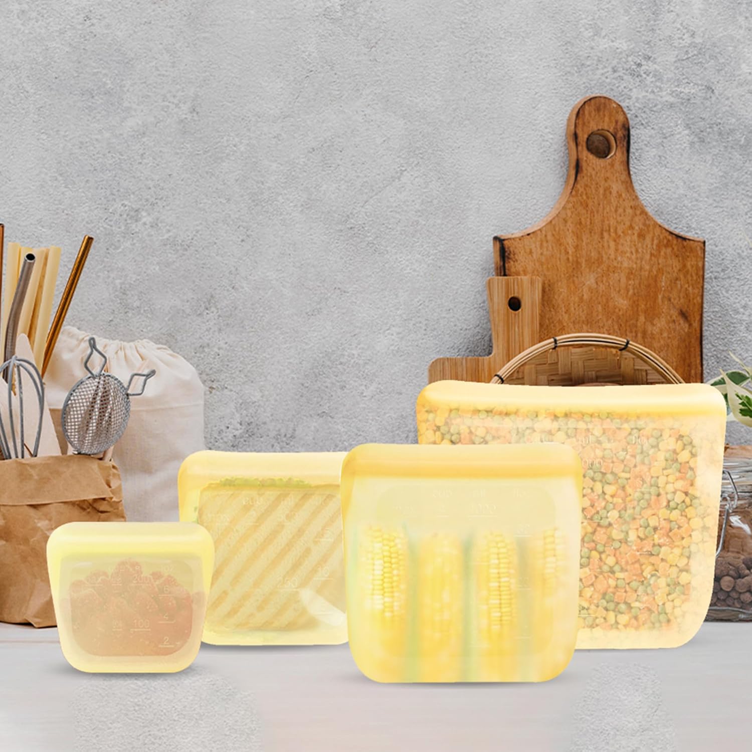 purifyou Set of 4 Reusable Silicone Storage Snack Bags 6oz / 16oz / 32oz / 64oz Self-Seal Food Storage Container for Fruits, Vegetables, Sandwiches, Dishwasher Safe & Leak-free (Pastel Yellow)