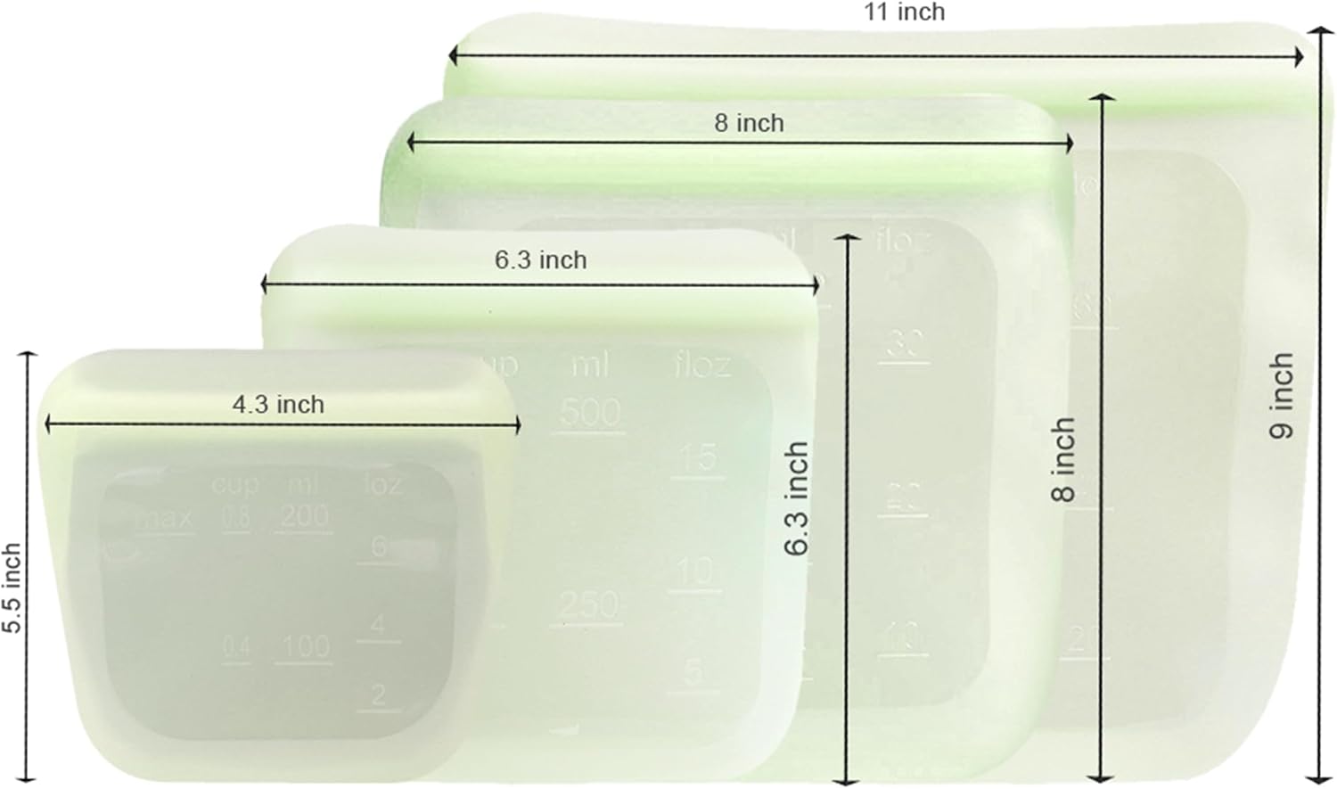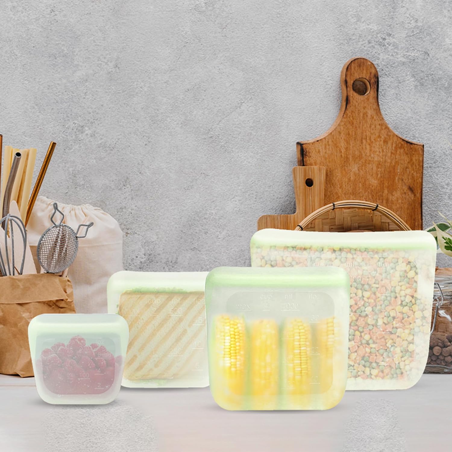 purifyou Set of 4 Reusable Silicone Storage Snack Bags 6oz / 16oz / 32oz / 64oz Self-Seal Food Storage Container for Fruits, Vegetables, Sandwiches, Dishwasher Safe & Leak-free (LimeCream)