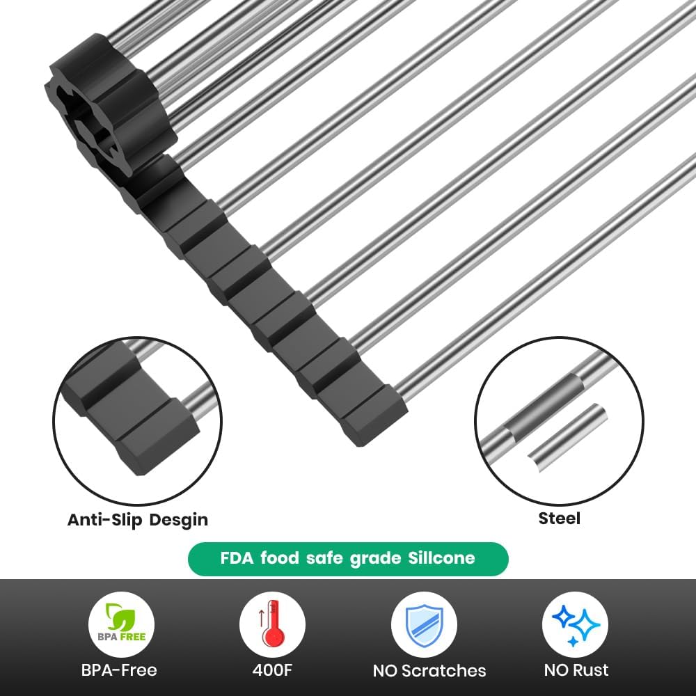 Roll Up Dish Drying Rack, Stainless Kitchen Accessories, Foldable Dish Rack, Anti-Slip Design Sink Counter Storage, Over The Sink Dish Rack, Stainless Steel, (21" x 9.1")