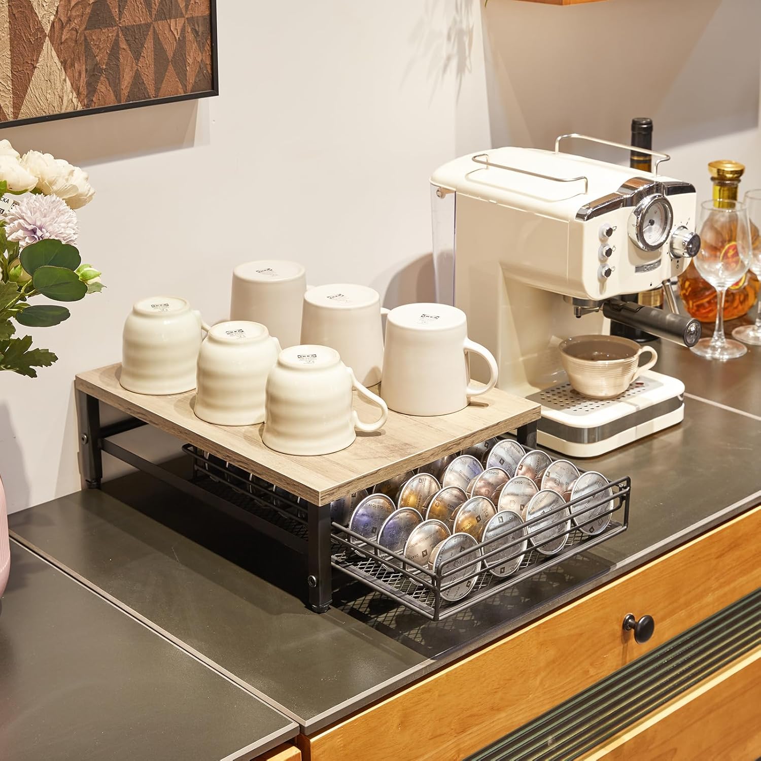 IBUYKE Wooden Coffee Pod Drawer Holder,Pod Holder,40 Capsule Pods,Coffee Pod Holder Drawer With Mesh Shelves,Home Kitchen Counter Organizer,Greige TCJ101Y