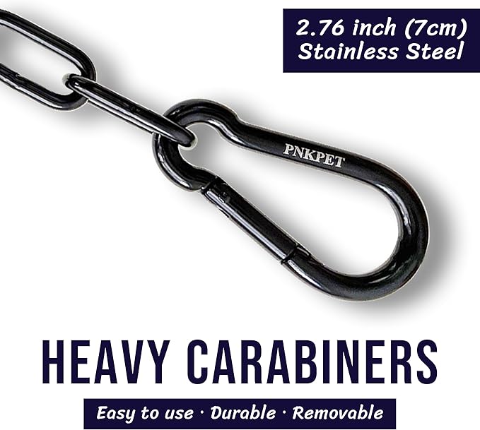 - Easy to Use Carabiners- Sturdy 304 stainless steel carabiners operates smoothly, is easy to press and springs back quickly. Both ends of the carabiners can be easily attached together or hooked onto the chain ring.