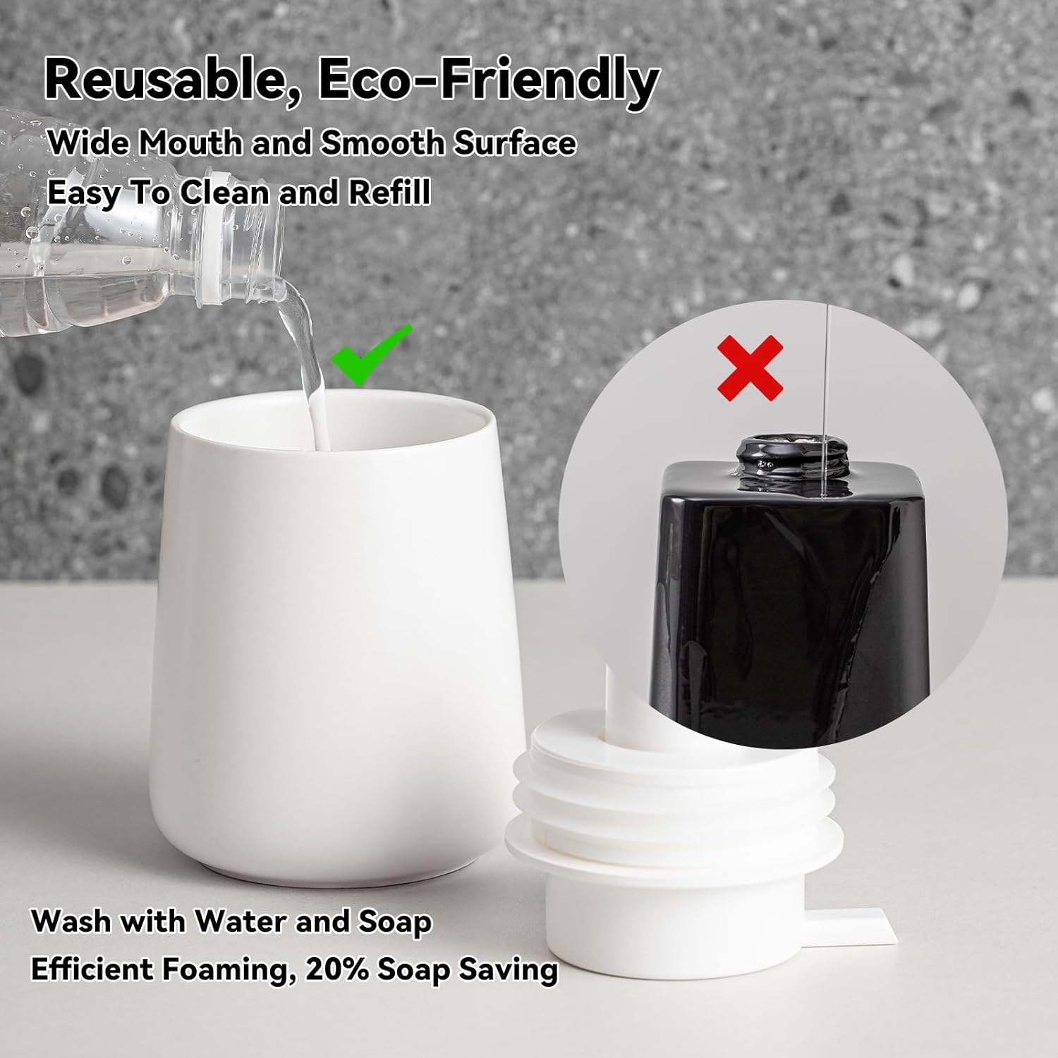 - Durable and refillable: Ceramic soap dispenser is easy to clean, hand soap dispenser bottle and plastic foaming soap pump can be reused