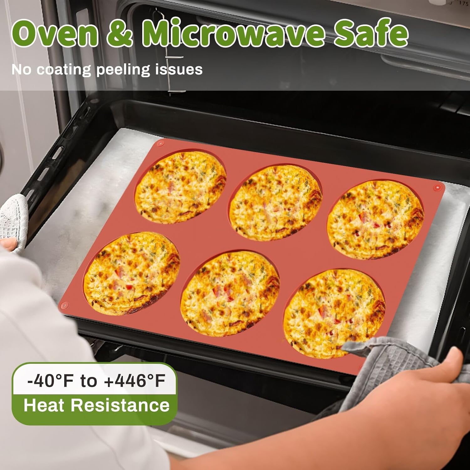 - Perfect Size: 2 pieces large round silicone baking molds with total 12 cavities, each cavity measures 4 inch x 3/4 inch (Deep), which bake large size eggs for egg sandwiches