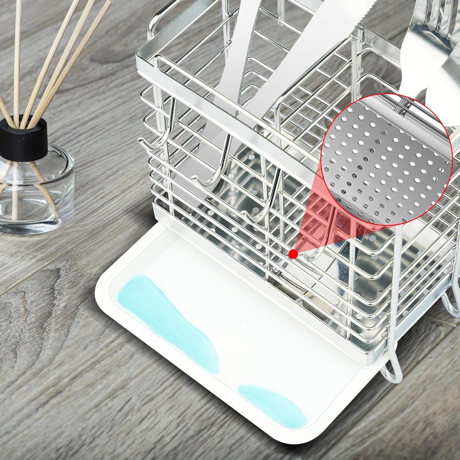 Utensil Holder, Stainless Steel Utensil Drying Rack with Drain Tray, Kitchen Counter Drainer Basket Silverware Cutlery Flatware Holder Forks, Knives, Spoons, Chopsticks Organizer (Silver)
