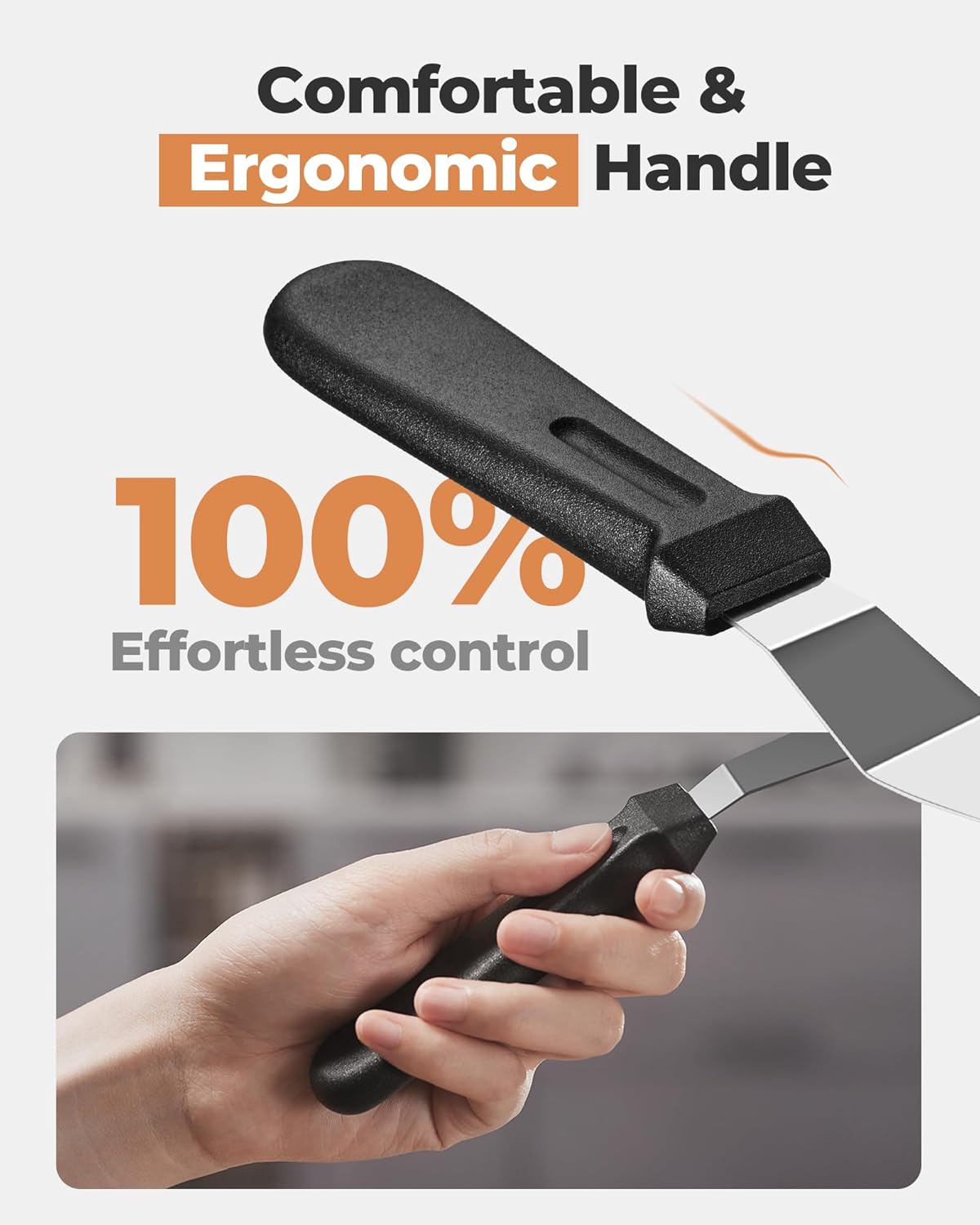 - Comfortable Handle: The black handle is made from premium material, has a non-slip surface, and an ergonomic design for easy gripping, so you can control the spatulas easily. The bent angle leaves a gap between the handle and your food, you can close to your cake without worrying about touching the icing.