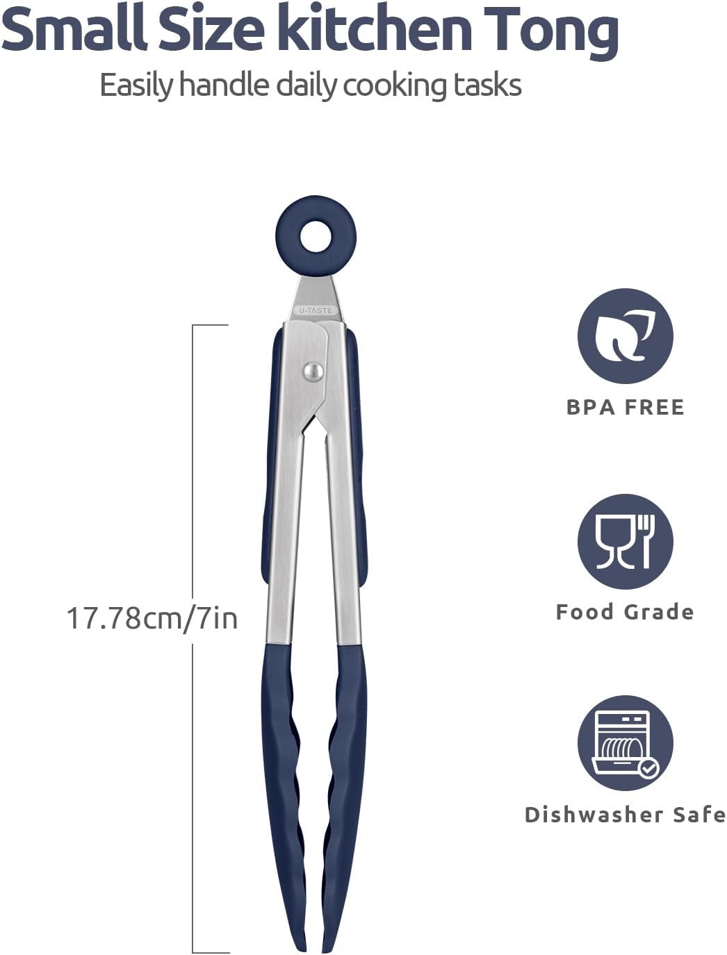 480ºF Heat Proof Kitchen Tong: U-Taste 7" Silicone Cooking Tong with Firm Sealed Non Stick Rubber Tips & Silicon Coated 18/8 Stainless Steel Handle & Smooth Locking for Serving Salad (Midnight Blue)