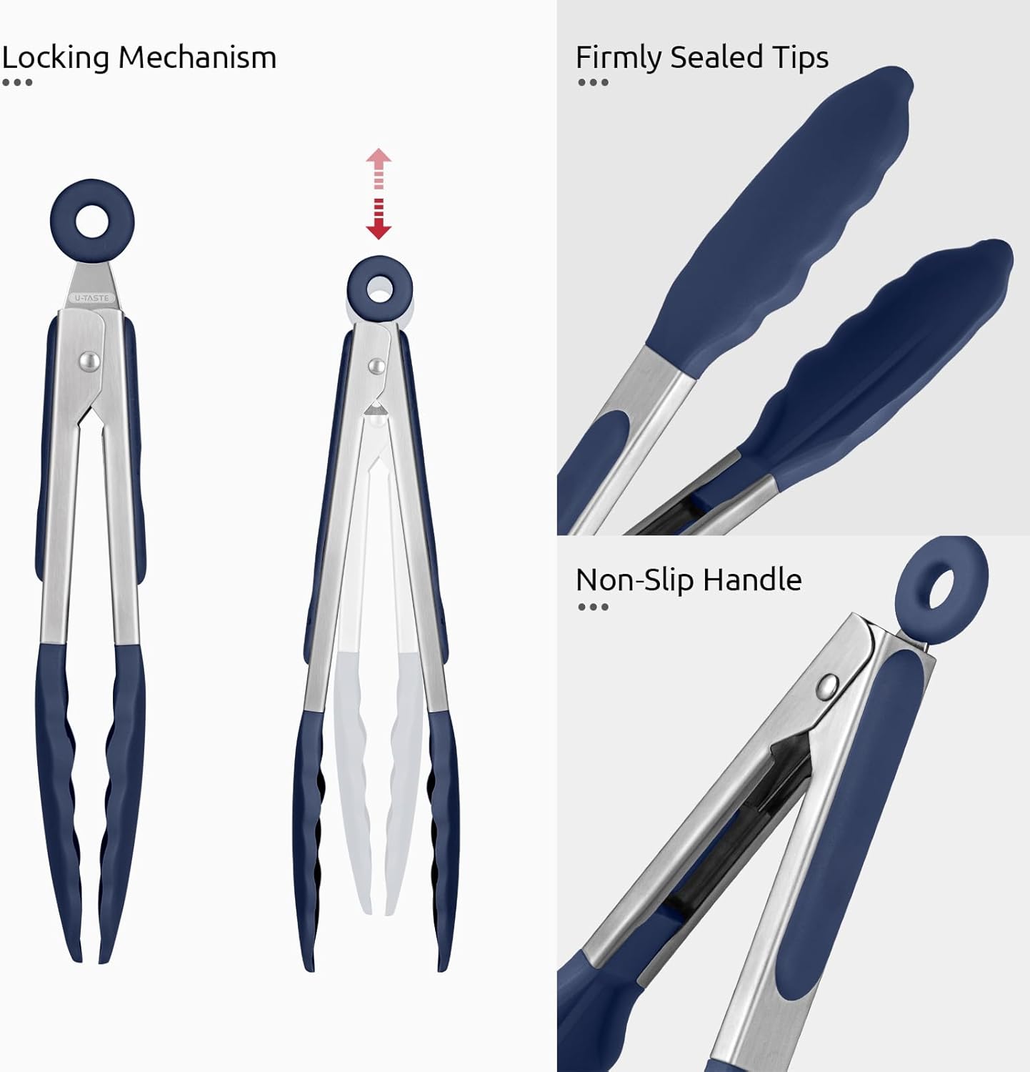 - [18/8 Stainless Steel Handles & Food Grade Silicone] U-Taste kitchen cooking tong set is made of 18/8 stainless steel and food grade silicone. Upgraded 0.8mm thick stainless steel is sturdier and tougher compared to the original version (0.6mm thick). Capable to serve a large piece of food with no sign of shaking or bending. No more strong smell, risk of rusting, deformation or any other problems like chipping off. Handles coated with Food Grade silicone provide a comfortable and not slip grip.