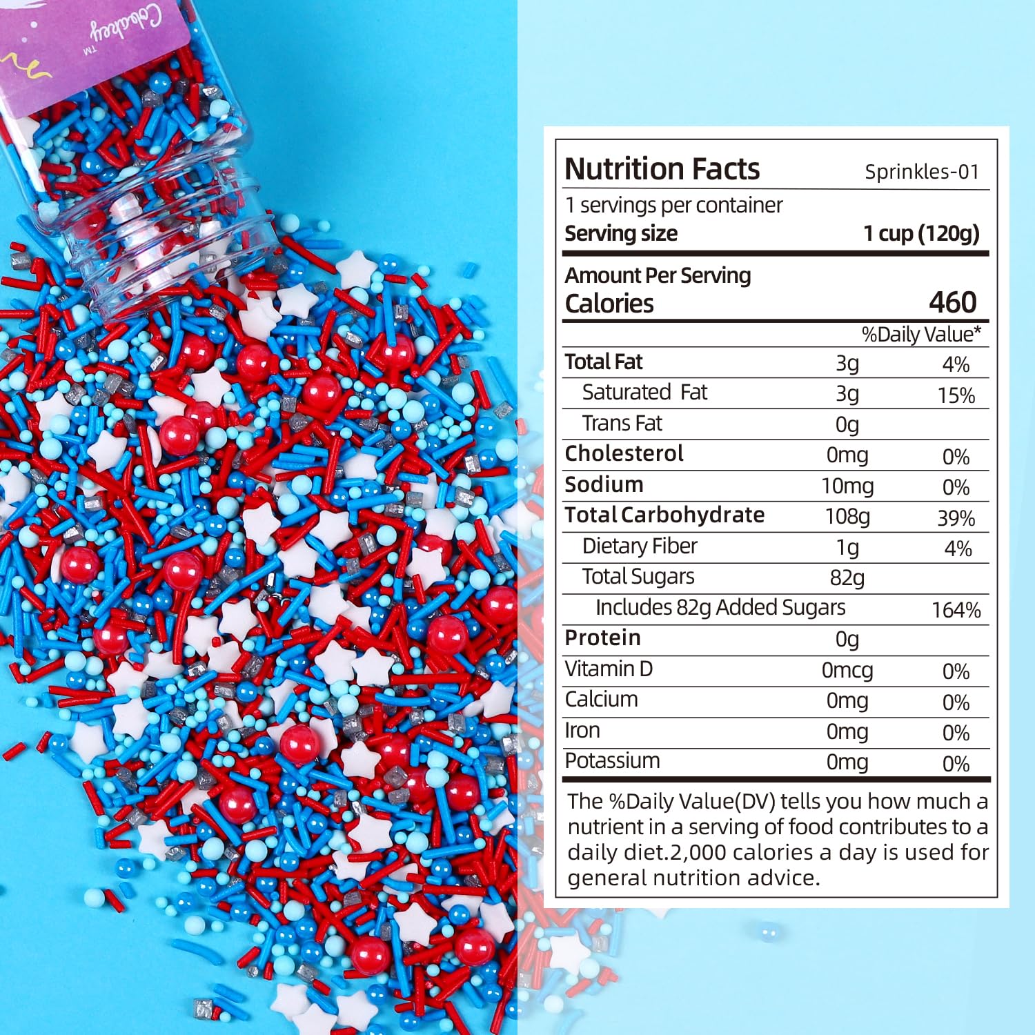 - Patriotic Sprinkles: Red White and Blue Sprinkles each bottle weighs 4.23 Oz. Our 4th of july sprinkles are made from safe ingredients. Perfect for creating an elegant or fairy-tale-like effect on desserts.