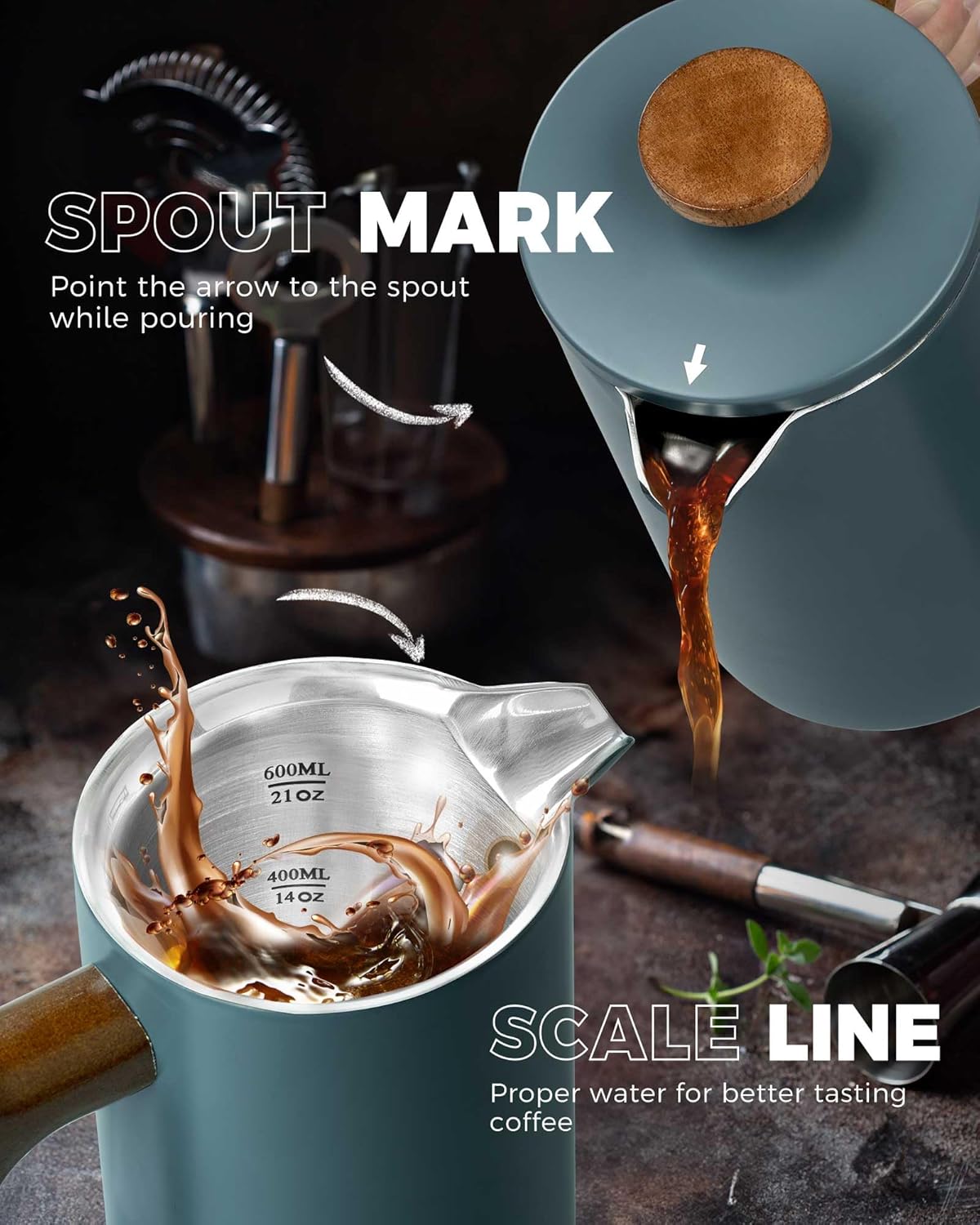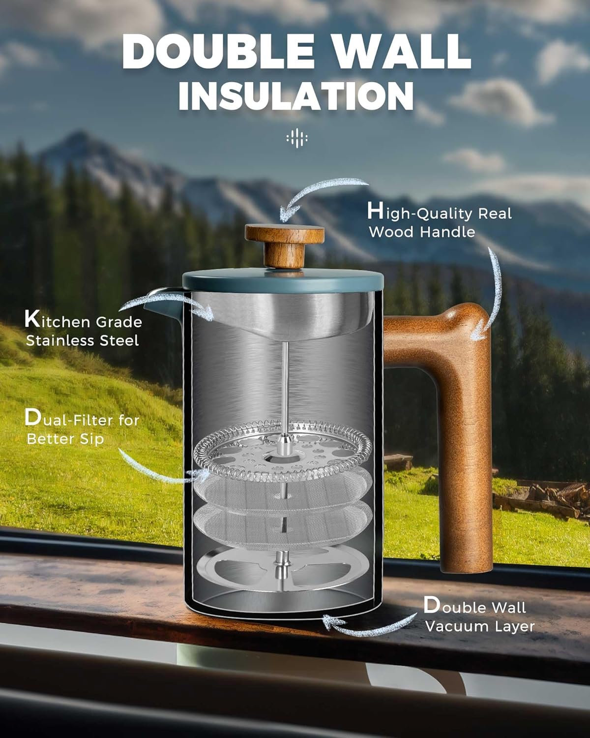 - THERMAL INSULATION: The double-walled vacuum layer construction of the french press keeps coffee hot for longer while ensuring the exterior remains cool to the touch. The spout indicator on the lid helps identify if the spout is closed to maintain coffee temperature.