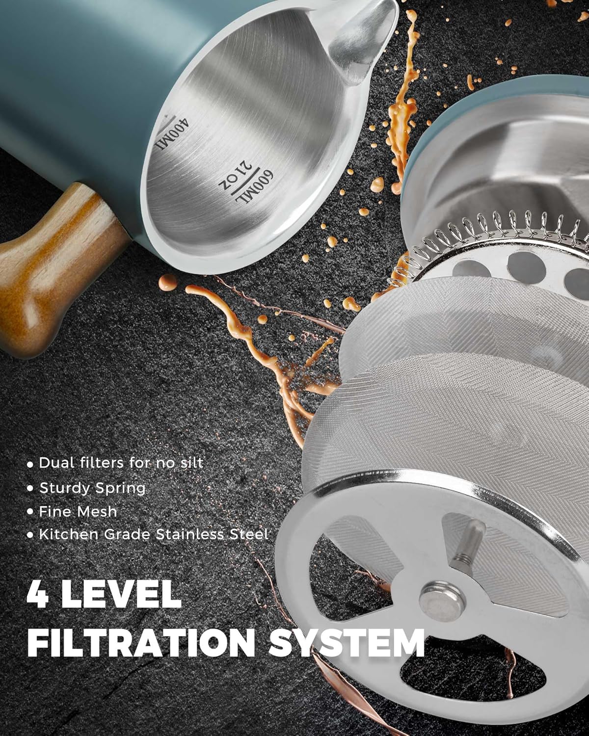 - SUPERIOR FILTRATION SYSTEM: This french press coffee maker is equipped with dual filters screens to minimize sediment in your cup, ensuring a clean and pure coffee experience. The package also comes with two replacement filters to extend the life of the coffee press.