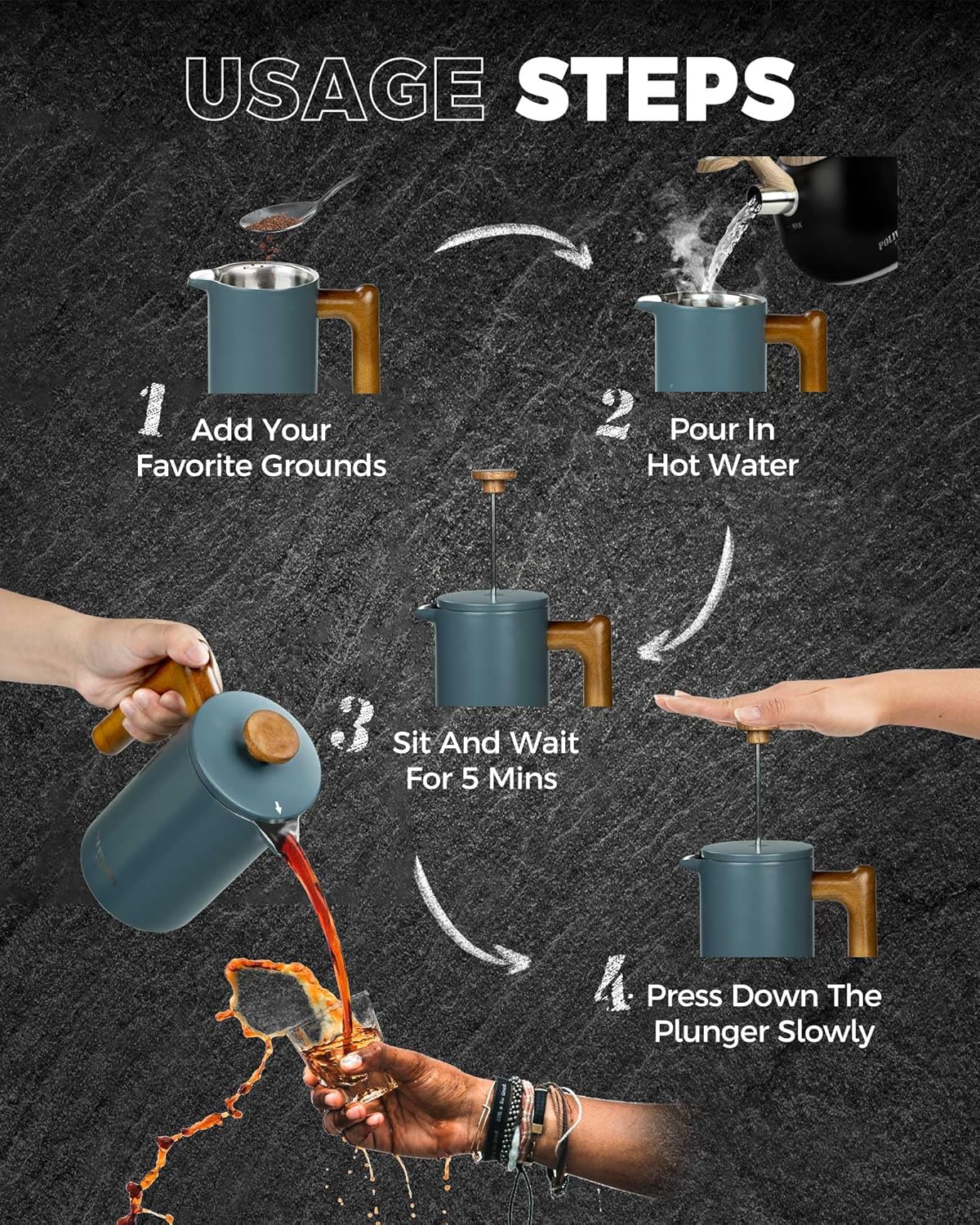 - KITCHEN GRADE STAINLESS STEEL MATERIAL: Crafted from high-quality stainless steel,the French Press is not only aesthetically pleasing with its sleek finish but also durable enough for both indoor and outdoor use. The 21 ounce capacity is suitable for different scenarios such as breakfast, working or camping.
