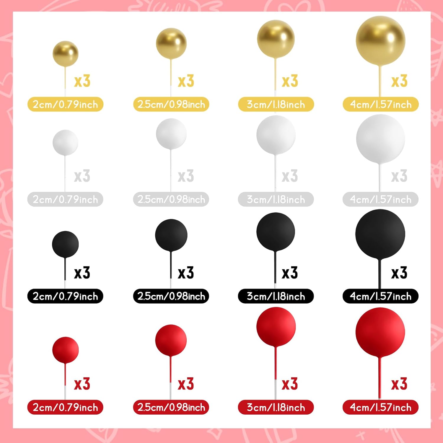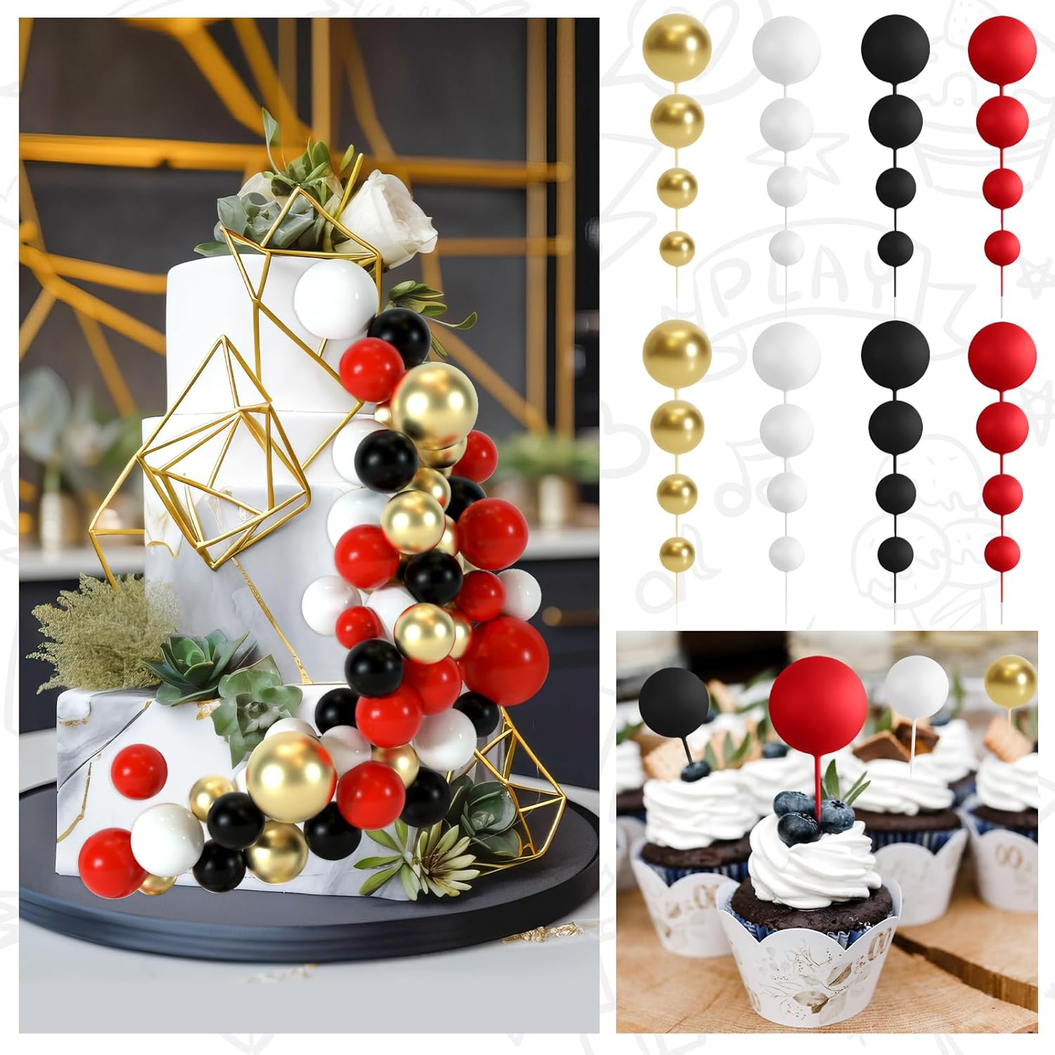 48 Pcs Balls Cake Topper Decorations Balloon Cupcake Toppers Foam Cake Topper Balls Cake Balls Decorations for Birthday Party Wedding Cake Decorating (Black, Red, White, Gold)