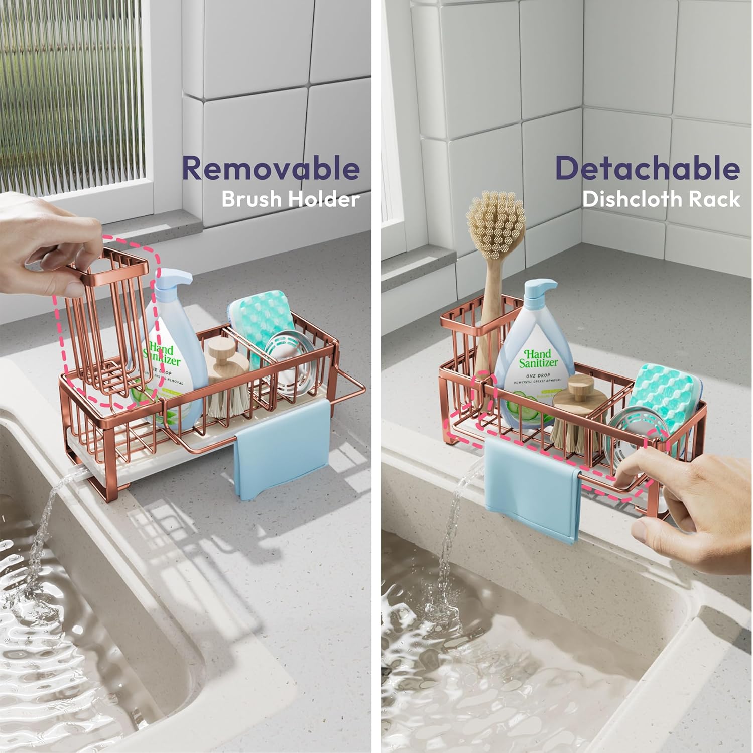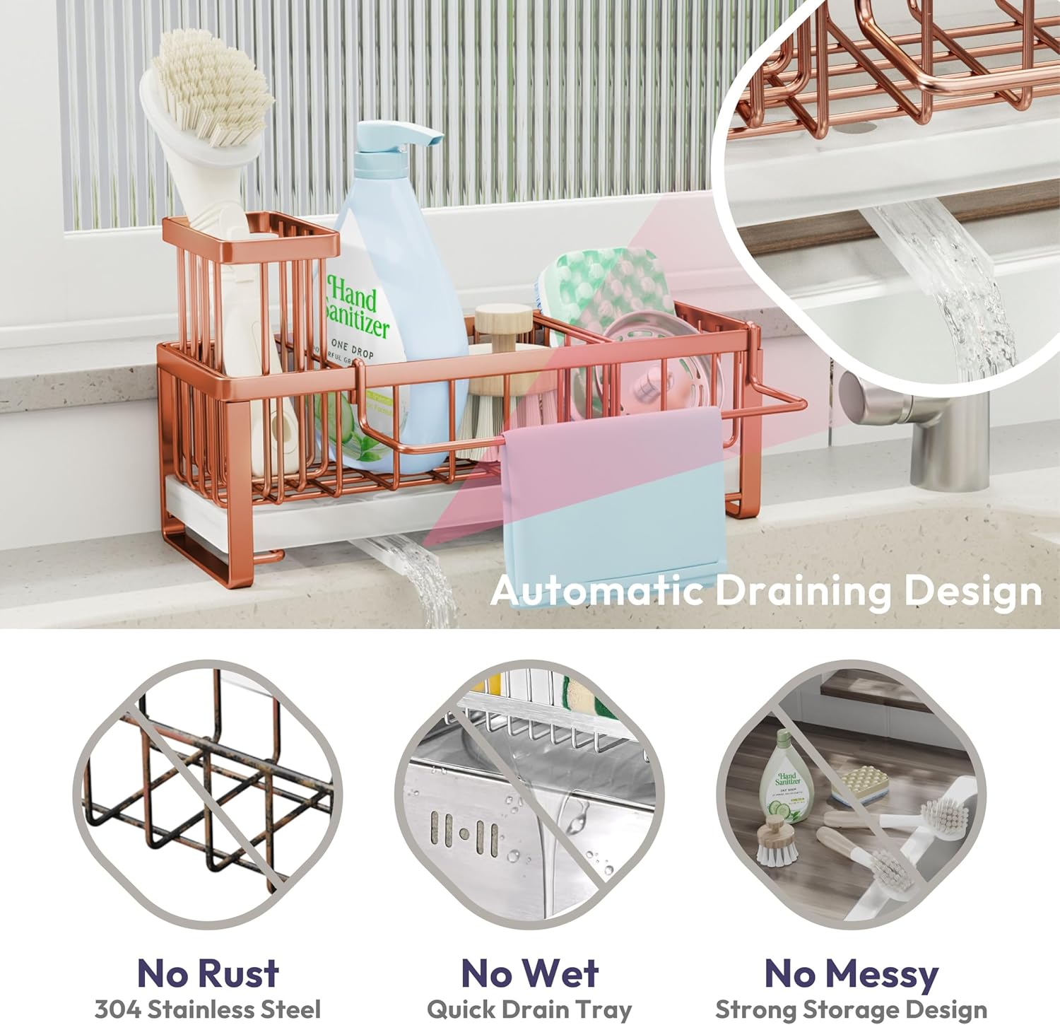 SWTYMIKI Sponge Holder for Kitchen Sink - Sink Caddy with Brush Holder Self-draining Sponge Caddy Organizer with Divider Stainless Steel Kitchen Accessories Storage for Countertop, Rose Gold