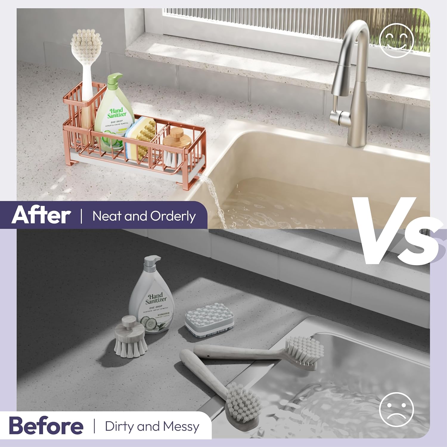 - [Large Storage Space Kitchen Essentials]: Our kitchen sink caddy organizer will give you a neat and clean kitchen for its strong storage capacity. Soap holder can hold three brushes, one rubber plug and a sponge, one bottle of soap dispenser-no swinging and no falling