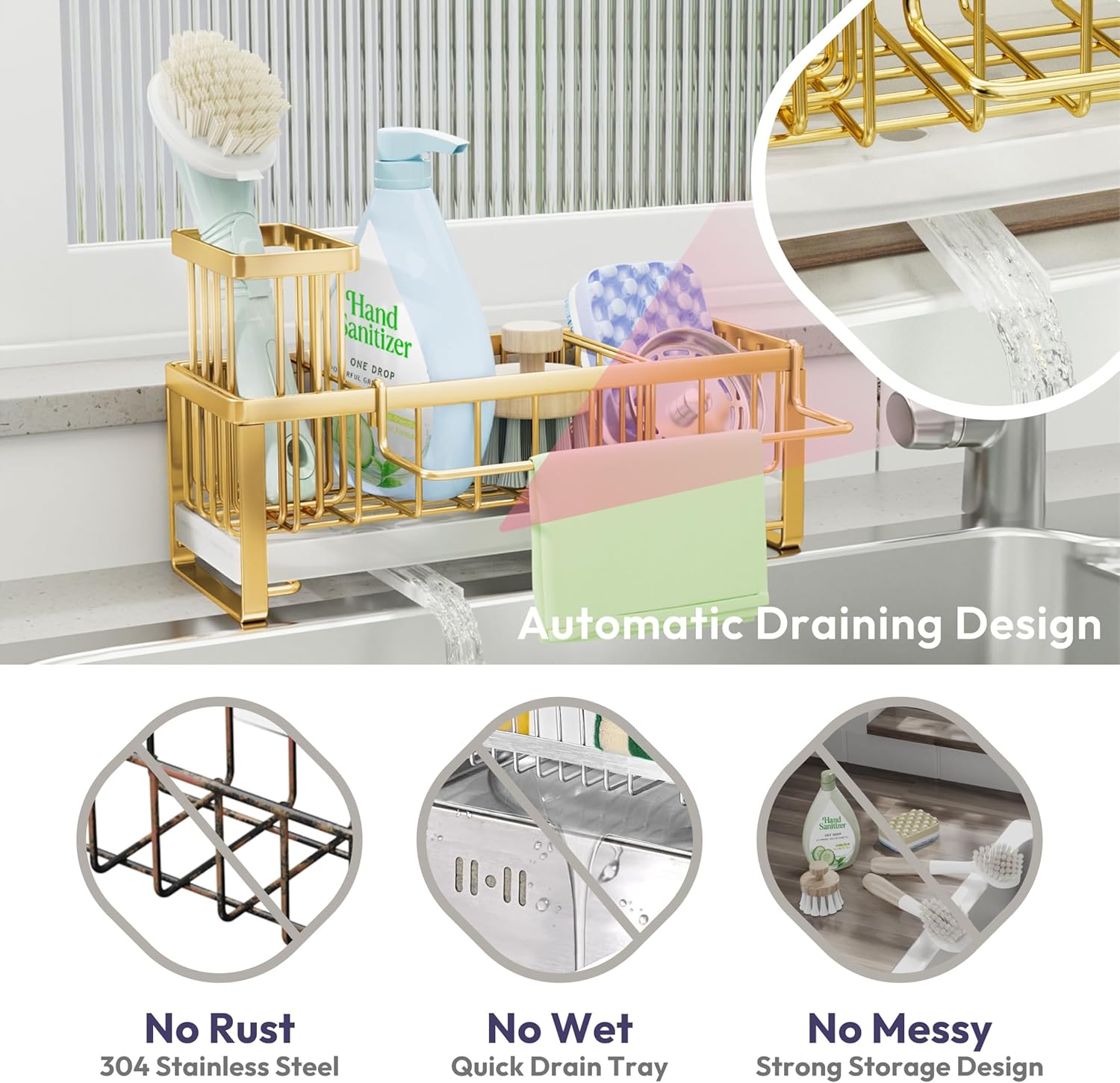 - [Automatic Draining]: Are you tired of cleaning the countertop?SWTYMIKI sponge holder for kitchen sink with 360° rotatable draining pipe can help you! Just put the sink caddy next to the sink, the water will drain automatically into the sink