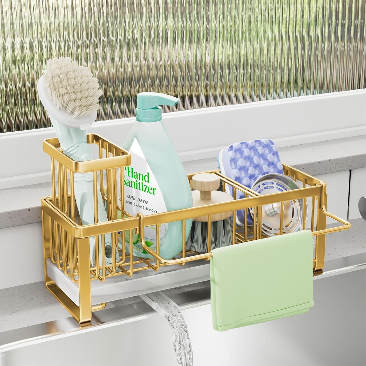 - [Large Storage Space Kitchen Essentials]: Our kitchen sink caddy organizer will give you a neat and clean kitchen for its strong storage capacity. Soap holder can hold three brushes, one rubber plug and a sponge, one bottle of soap dispenser-no swinging and no falling