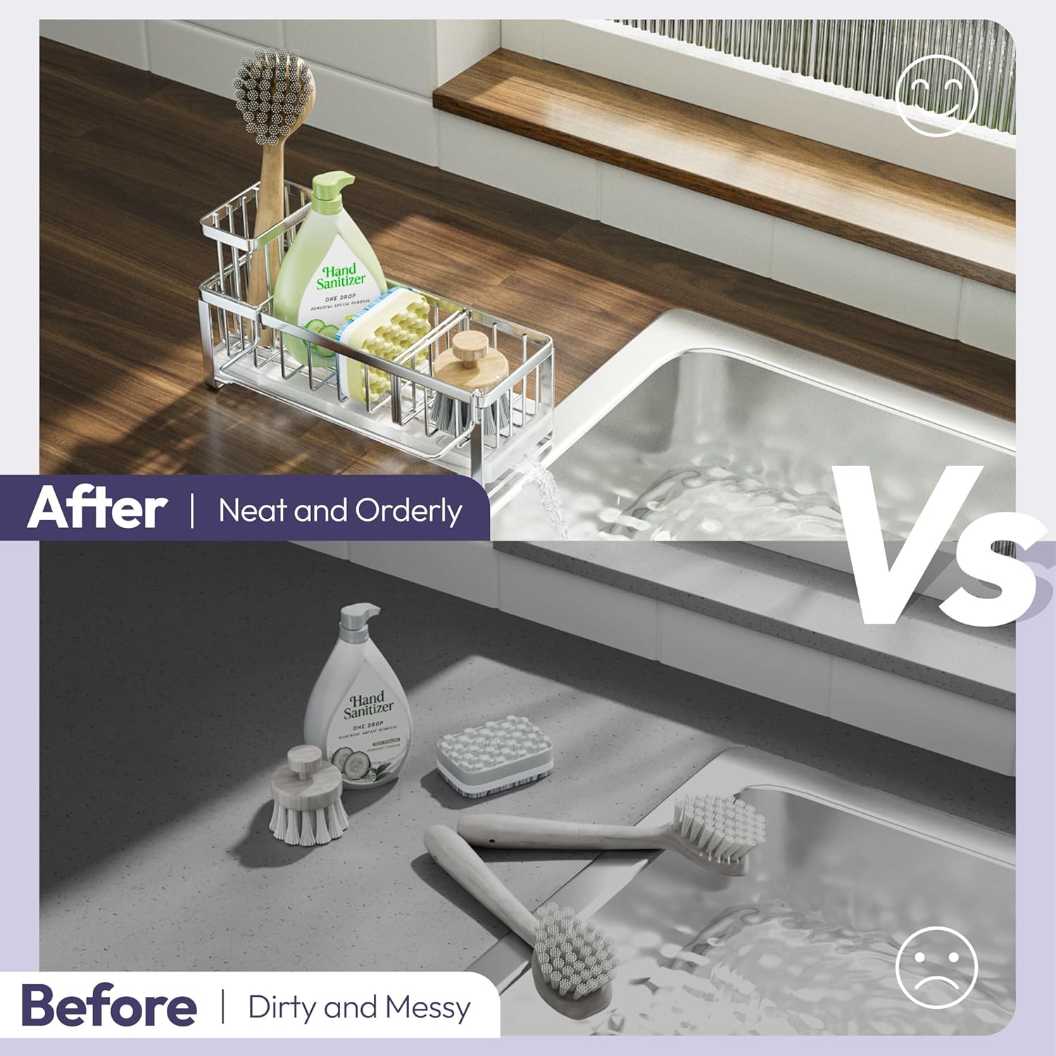 - [No Installation & Service]: Sink organizer sponge holder don’t require installation, you can use it when you recieve it. And you can reach out to us if you have any question about the kitchen countertop organizer, we will try our best to solve your problem in 48 hours
